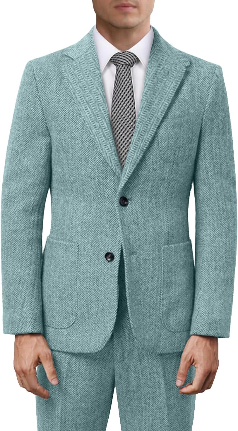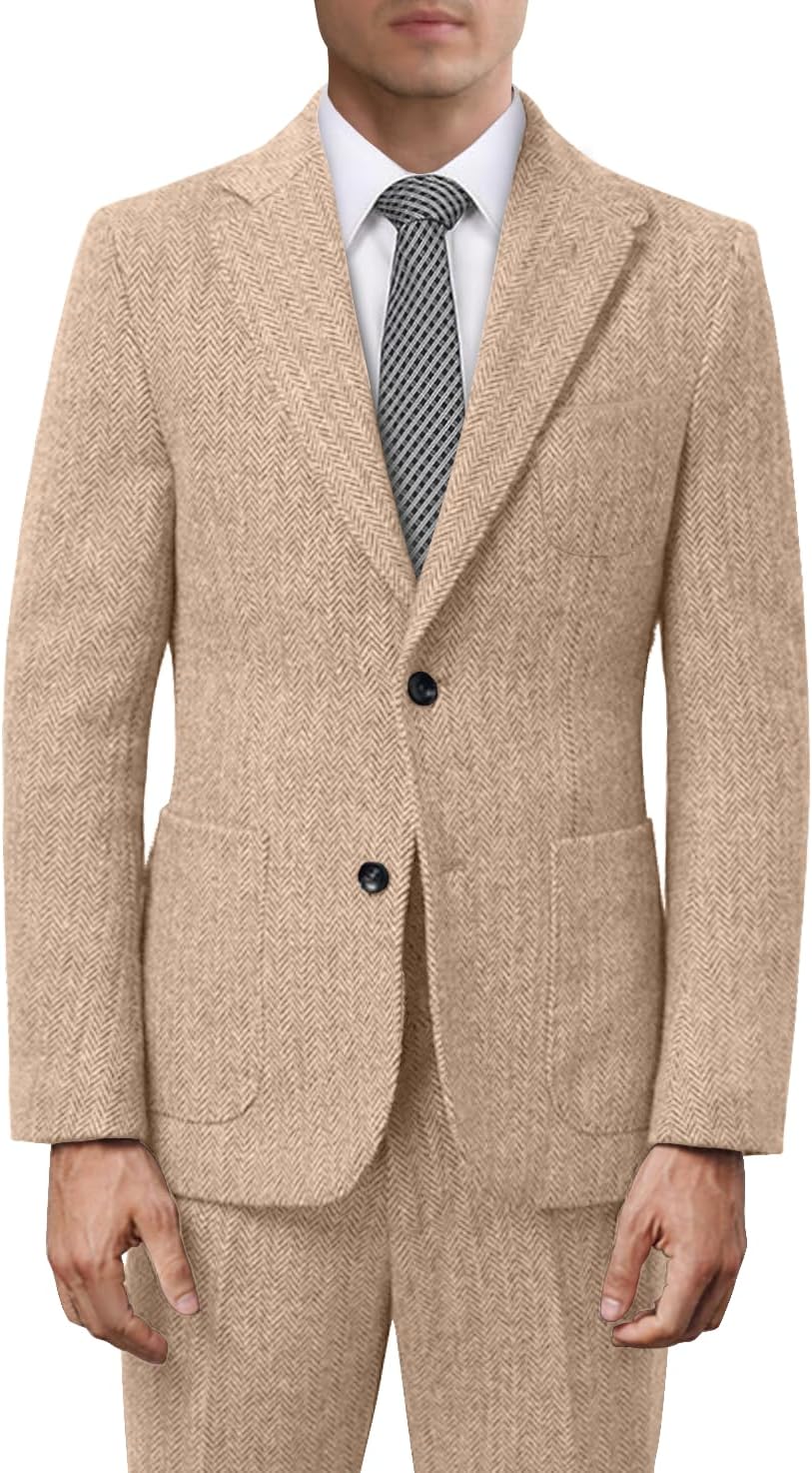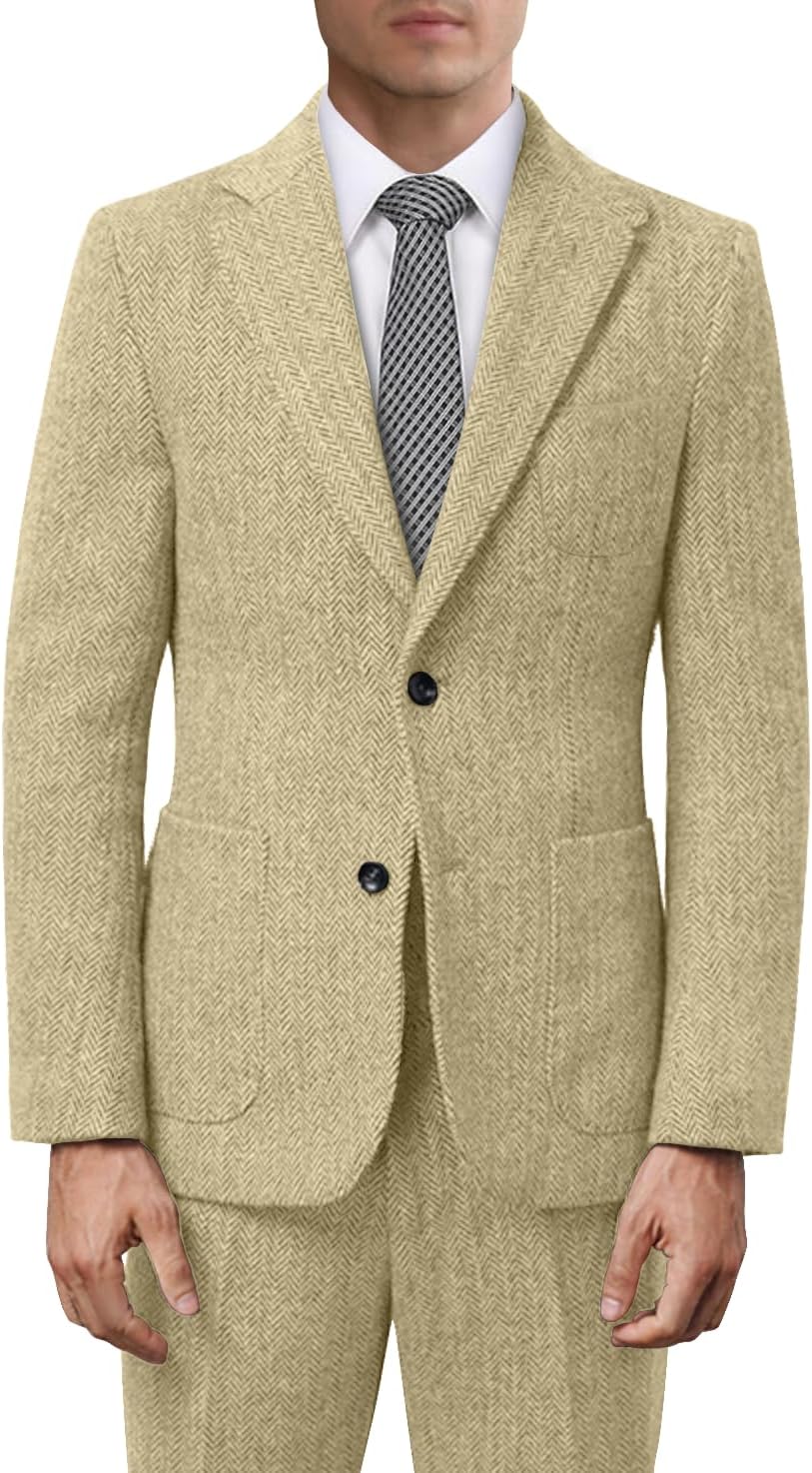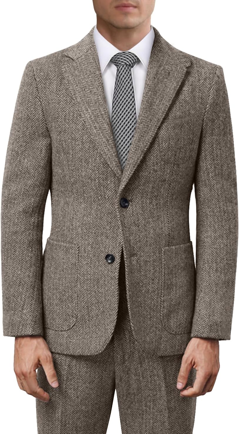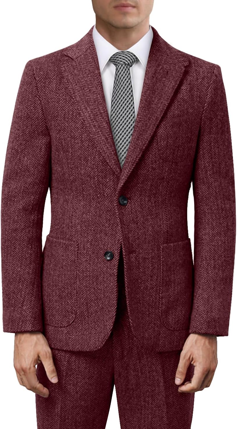 Package List: Classic Men 3 Pieces Suit Set: Herringbone Tweed Wool Suit Jacket * 1, Herringbone Tweed Wool Dress Suit Pants * 1.