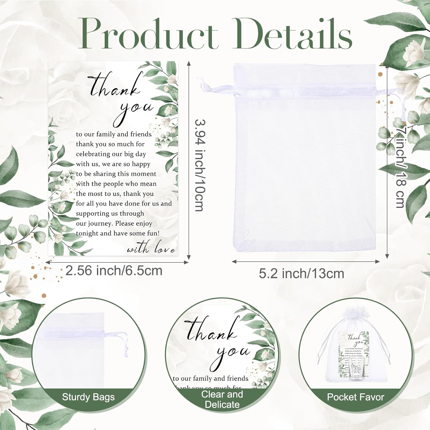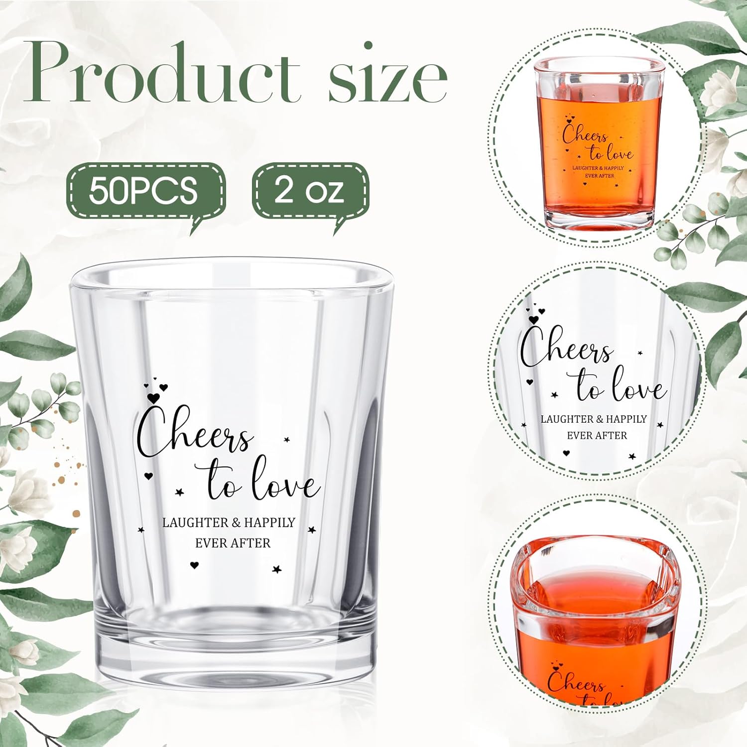 Features: A Thoughtful Gift and Wedding Keepsake: Impress your guests with a favor they'll truly appreciate. These Personalized Wedding Shot Glasses can be used as decorative pieces, bar essentials, or sentimental keepsakes, making them a wonderful way to express gratitude to friends and family who joined your special day. Versatile for Various Wedding Events: While perfect for wedding receptions, these elegant glasses are also ideal for Bridal Showers, Engagement Parties, and Anniversary Celebrations. Their stylish design and practicality make them excellent Elegant Bridal Shower Party Supplies, adding charm and sophistication to any pre-wedding event. Specifications: Material: glass Color: clear Size: Shot glass: about 2.44 inches tall Thank-you cards: about 3.5 x 2.4 inches Package includes: 50 x Cards 50 x Shot glass 50 x Bags Notes: Manual measurement, please allow slight errors on size. The color may exist a slight difference due to different screen displays.