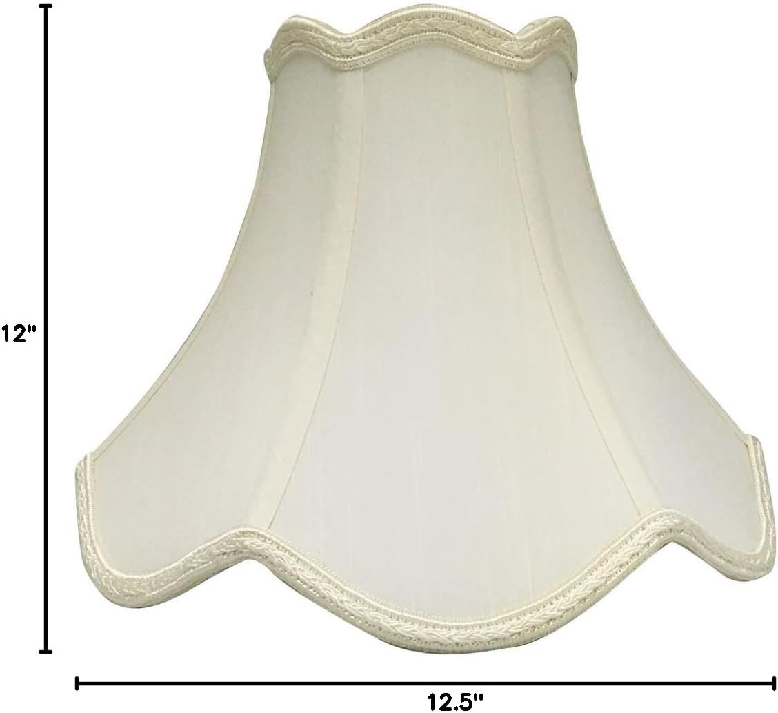 This scalloped bell designer lampshade is a part of Royal Designs, Inc. Timeless designer shade Collection and is perfect for anyone who is looking for an elegant yet detailed lampshade. Royal designs has been in the lampshade business since 1993 with their multiple shade lines that exemplify handcrafted quality and value. Exterior fabric: hand tailored silk-type shantung (except linen fabrics) interior fabric: off-white softback lining (black and other colored fabrics have gold lining) washer: standard brass-finish spider Fitter, use a finial to fasten shade. (All shades with 9"+ top diameter have a v-notch Fitter for use on a 6" or 8" reflector bowl) trim: top and bottom designer trim (single, double or braided) with vertical piping frame: heavy grade rust resistant metal frame bulb: suggested maximum wattage is 150-watt for most sizes (clip on shade Max 60W) height is measured by slant height from top to bottom of the lampshades' front face please measure your existing shade-aa replacement harp may be needed for a proper fit or additional adjustment if changing height of shade.