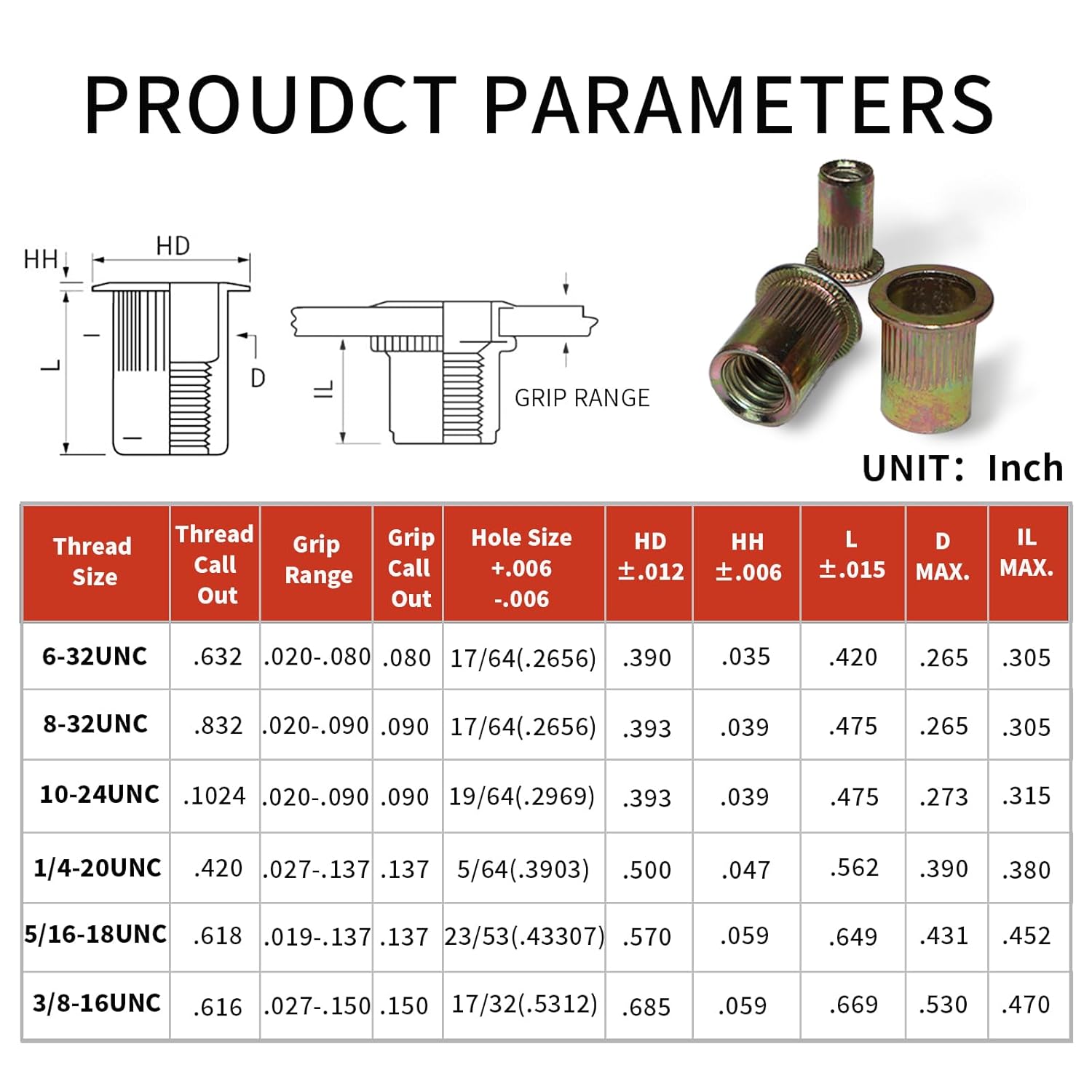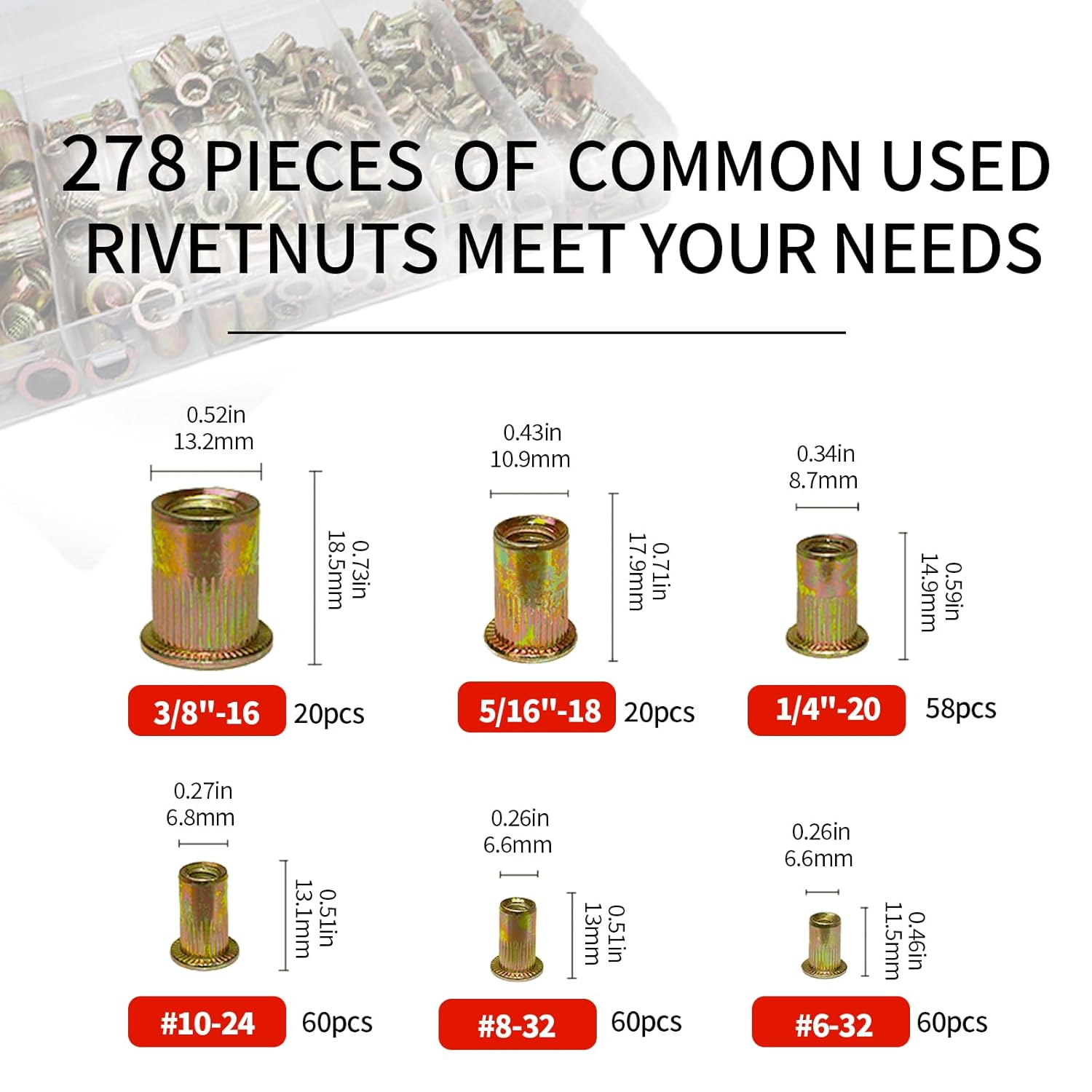 SAE stainless steel and carbon steel rivet nuts assortment kit, 494 pcs.