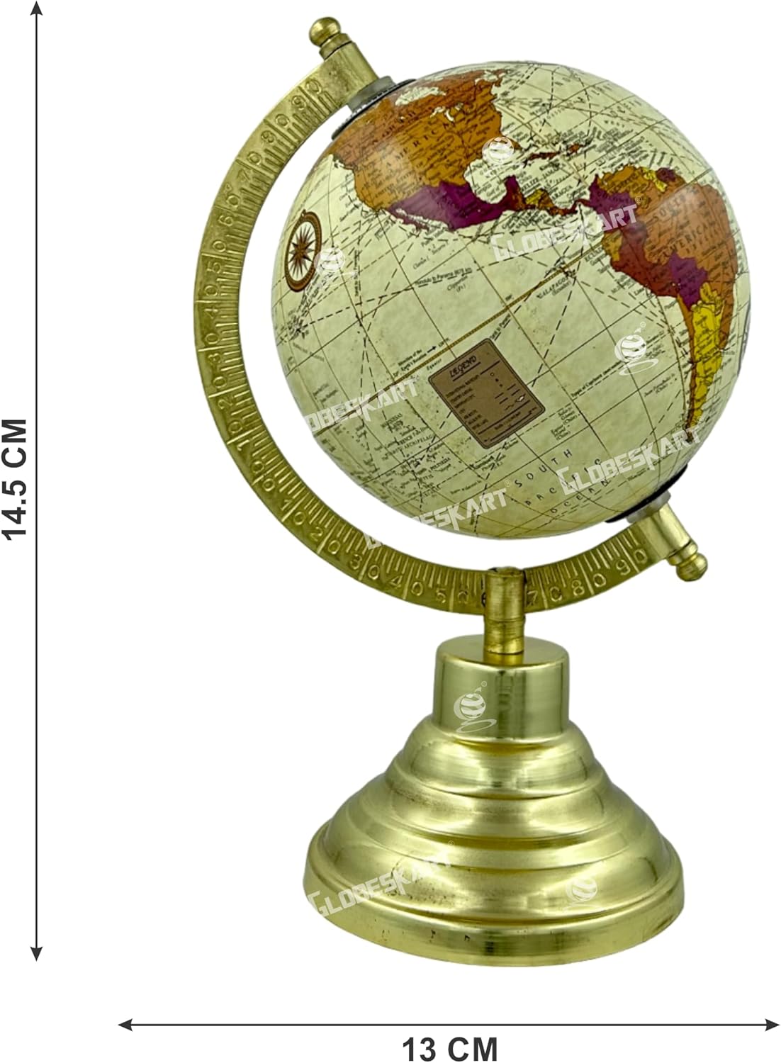 Antique world globe that rotates pretty much like how our earth does. You can put it on a flat surface, like your office desk or your study table, and have the world at your fingertips for endless journeys of fun and learning. Durable and Portable Thoughtfully designed from recycled plastic, this rotating globe with an arc and base is sturdy and durable. Moreover, its compact size and lightweight design, makes it convenient to carry from one place to another. It is a piece of art.