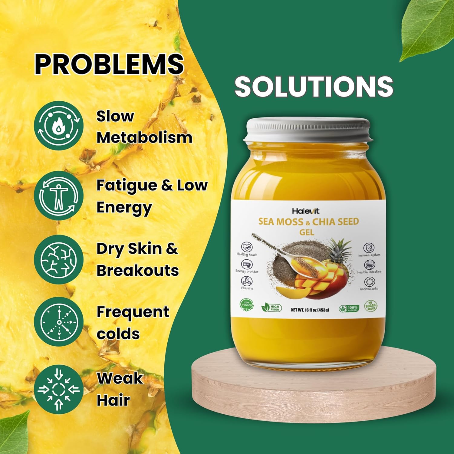 Halevit Sea Moss Gel with Ground Chia Seeds and Mango Flavor is a 100% natural product combining the health benefits of sea moss, ground chia seeds, and fresh mango puree. This delicious superfood gel provides essential vitamins, minerals, antioxidants, and fiber.