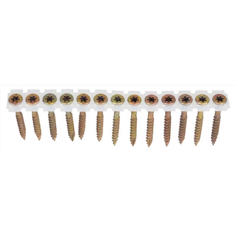 Rex drive recess provides smooth engagement with high torque transmitting capability reducing operator fatigue, and extending bit life.; ; Brand Name: Senco Callout Size: No. 8 Length: 2 in. Drive Style: Rex Finish: Yellow Zinc Product Type: Wood Screws Number in Package: 1000 pk Indoor or Outdoor: Indoor and Outdoor Thread Type: Twin Thread Material: Steel Packaging Type: Boxed Head Type: Flat Head