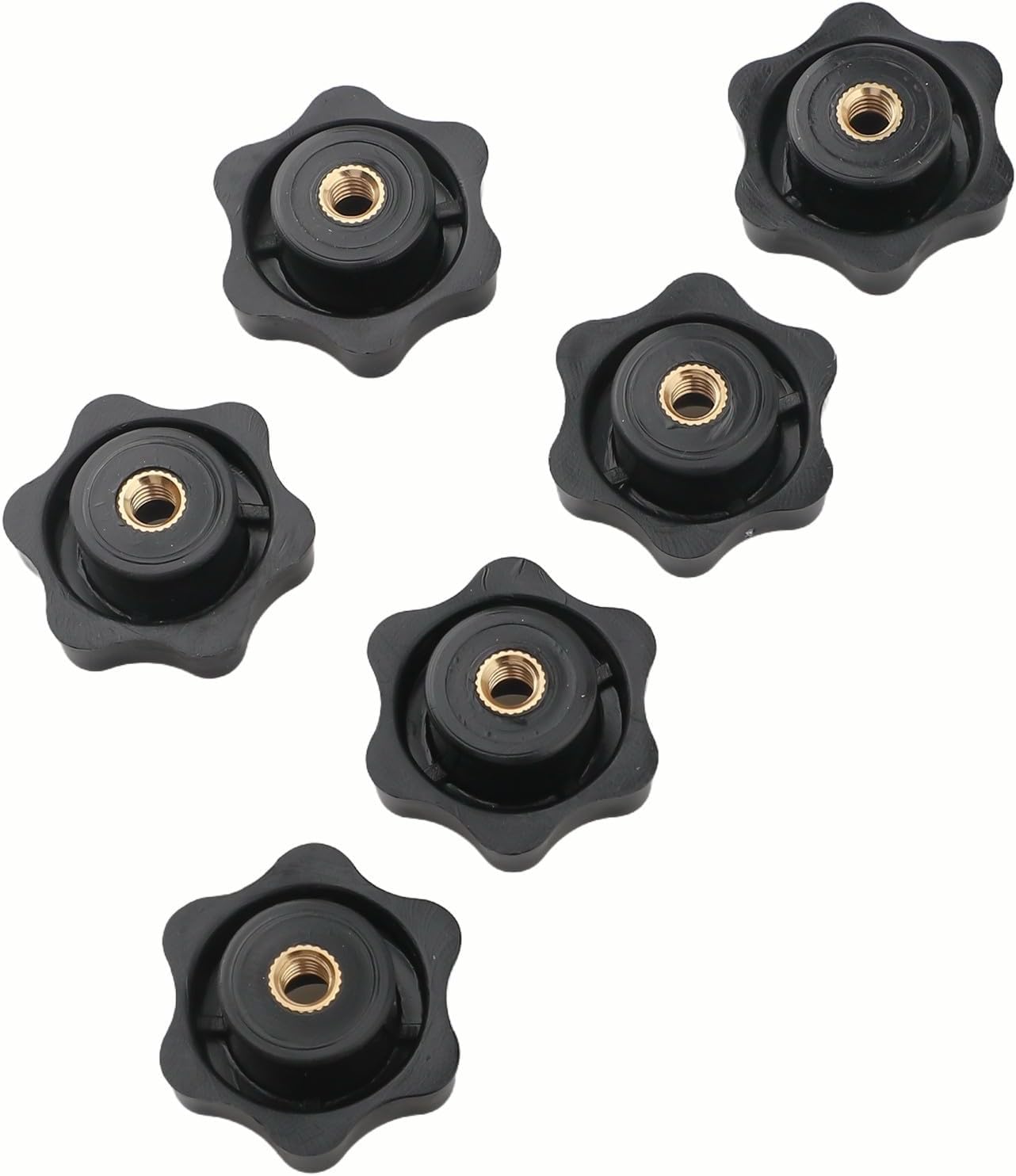 Features:* M6 star grip nuts: These nuts feature a head diameter of 38mm and an internal thread diameter of 6mm.* Rust and resistant material: Made from plastic and brass, these nuts are highly and can withstand harsh conditions.* Easy to install: The clamping nut is designed with a threaded mechanism, allowing for effortless screwing into the desired mechanism. It serves as a perfect replacement for old or broken handles.* for Versatile applications: Suitable for manual adjustment in various industries such as mechanical engineering, furniture, machine tools, fitness equipment, and industrial equipment.Specifications:Part Name:M6 Clamping NutsMaterial:Plastic and brassSize:38mm*6mmColor:BlackPackage Content:6 PCS M6 38mm Clamping Nuts