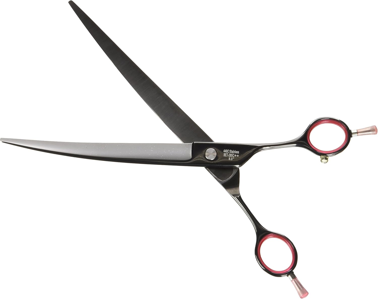 Japanese 440C Stainless Curved 8.0 inch Black Titanium opposing handle design, double finger rest (flipper) with Red Gem Stone Adjustable Tension Knob, super comfortable.