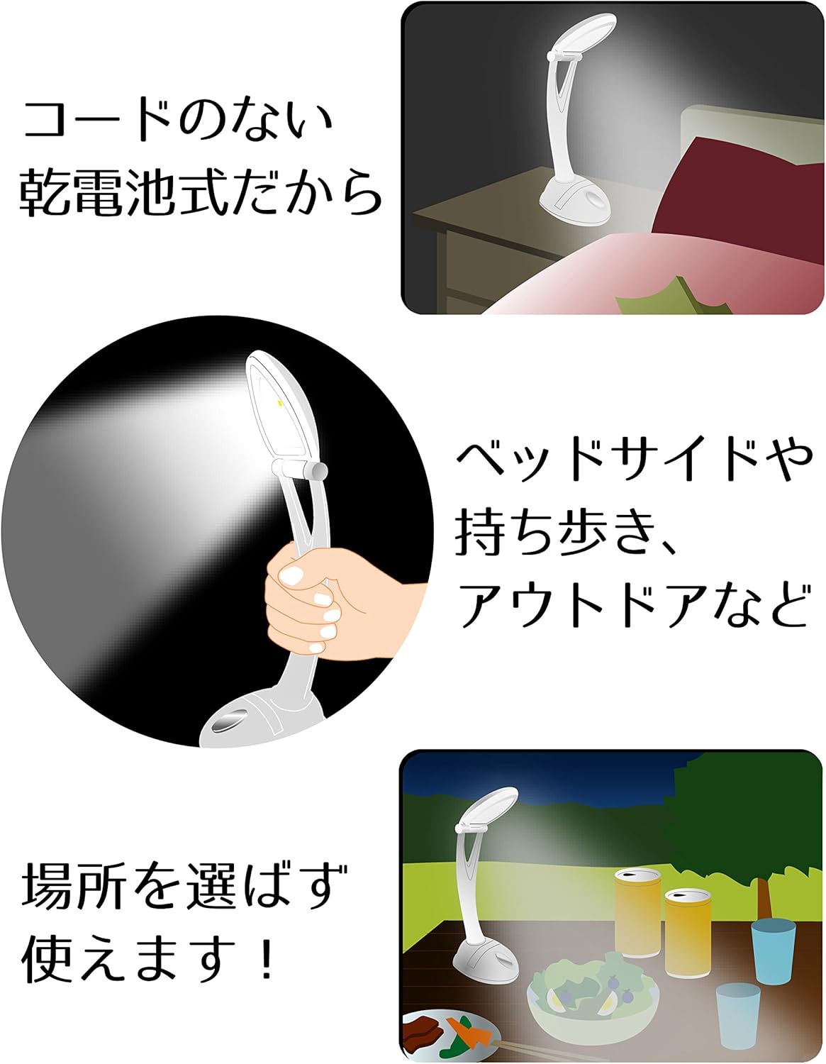 Compact stand light that uses batteries; No cord is required, so you can store it anywhere. Great for bedside and outdoor use; The head can move about 180 degrees up and down, so you can adjust the angle to your preference; The main unit has a stand that can be placed on your smartphone.
