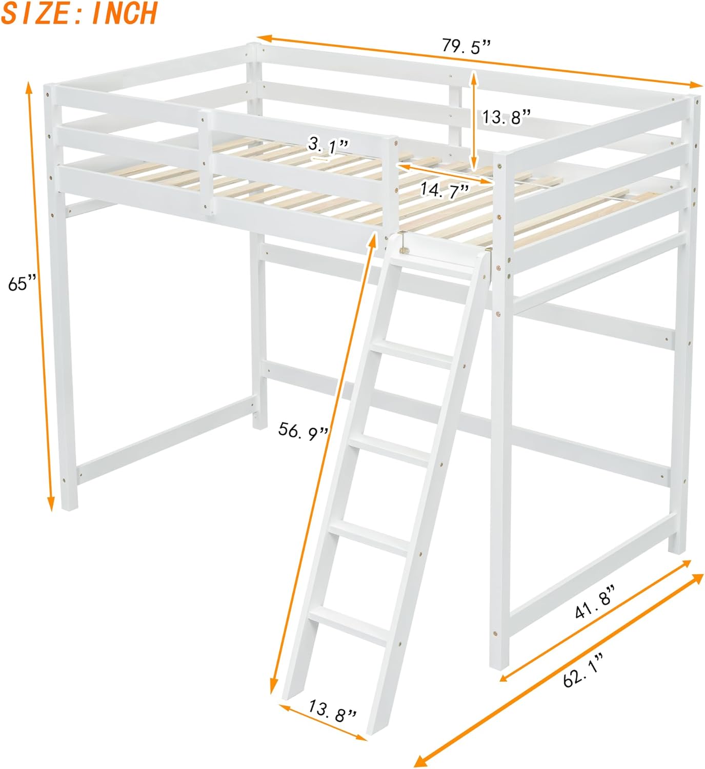 · [Elegant design] This Solid Wood Twin Size Loft Bed with Ladder is designed with a clean silhouette and a hue of elegance. It gives any room a spark of style that's both modern and timeless.· [Solid Construction] The bed structure is crafted from high-quality solid pine wood, solid pine legs and a strong, durable frame so that the bed is sturdy and durable. · [Stability] Fourteen evenly spaced and solid wood slats blend naturally into the already sturdy frame to give added ground-up support that provides stability. The loft bed features guard rails for added safety, and is accessible via the sturdy, slanted ladder. Enjoy many long years of relaxation and family fun, secure in this meticulously designed wood platform bed. · [Health and Comfort] No box spring required, and without needing a foundation. The simple yet elegant wood frame is sturdy and comes with slats for extra support and ensures air moves freely around your mattress to keep it fresh for years to come. · Dimensions: Overall Product Dimension: 79.5" x 41.8" x 67.5"(L x W x H). Mattress not included. Some assembly is required, although we have provided clear instructions and tools.