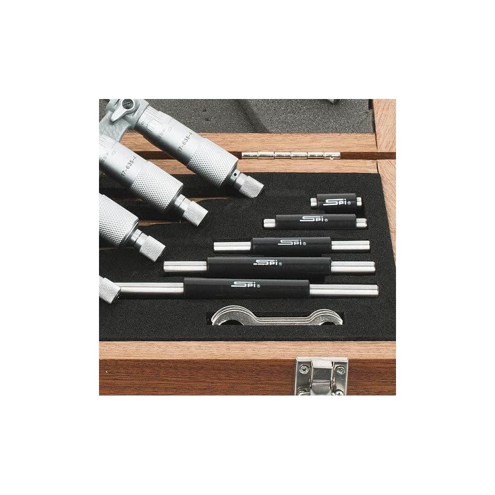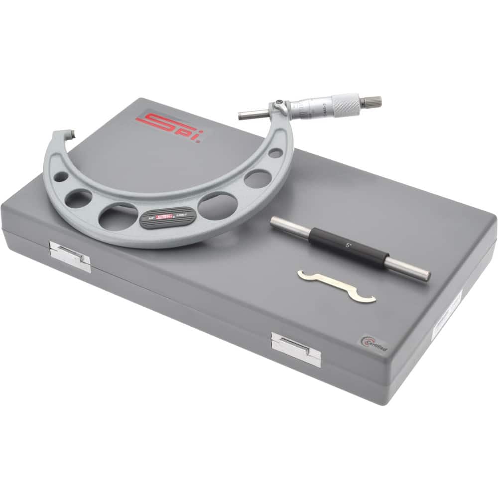 SPI calibrated mechanical outside micrometer set with ratchet stop and spindle lock. Accurate to 0.0001" (0 to 1 inch) and 0.0002" (1 to 6 inch) with 0.0001" graduations. Carbide tipped measuring face and painted steel frame for durability. Short form calibration certificate, standards, and fitted case included.