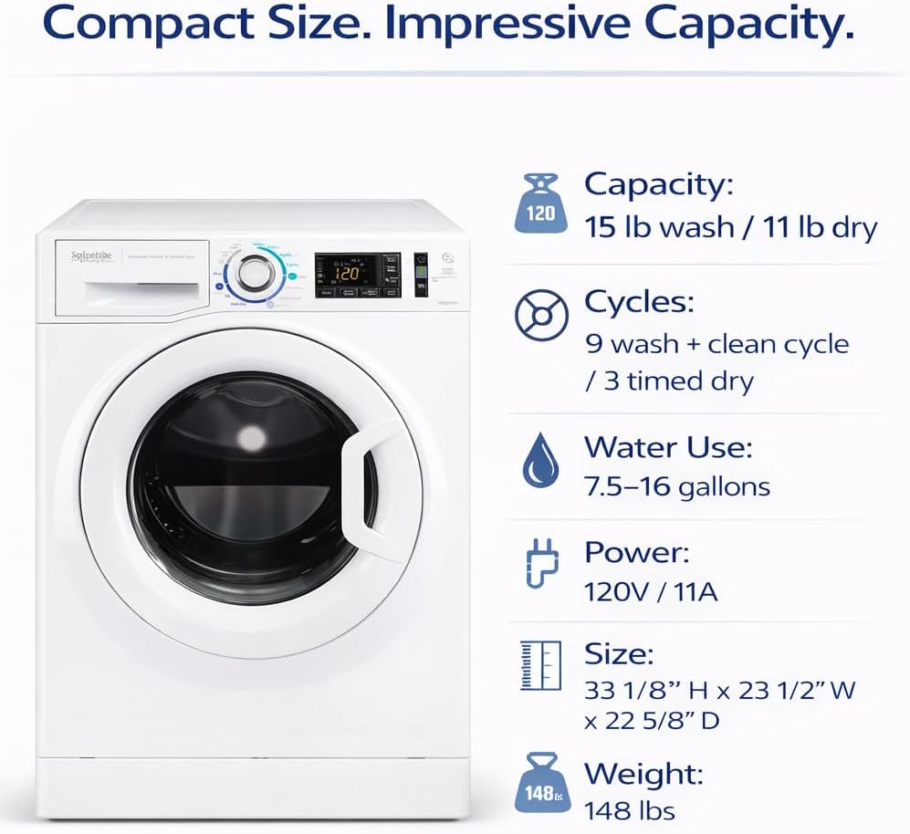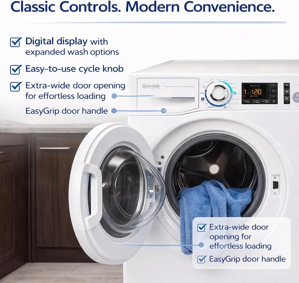Enjoy the convenience of clean, dry laundry wherever the road takes you with the Splendide XC Combo Washer/Dryer—a powerful washer and dryer in one compact unit, designed specifically for RVs and small living spaces. From heavy jeans and towels to delicate silks and wools, the Splendide XC delivers exceptional wash and dry performance while using minimal water and space. Choose a wash cycle, a dry cycle, or go straight from wash to dry without transferring laundry. The intuitive control system combines a classic cycle knob with a modern digital display, making it easy to customize programs or check cycle status at a glance. An extra-wide door opening and EasyGrip handle make loading and unloading effortless, while the swing-out detergent dispenser automatically releases detergent, bleach, and softener at the right time. Advanced spin technology and a dual-rotating drum help reduce creasing, improve drying efficiency, and operate quietly—perfect for life on the road. Built tough for RV travel, the Splendide XC features a first-of-its-kind winterization cycle, a self-cleaning lint filter, and a clean cycle that keeps the washer drum smelling fresh. Compact, efficient, and reliable, the Splendide XC Combo is the smart solution for on-the-go laundry convenience.