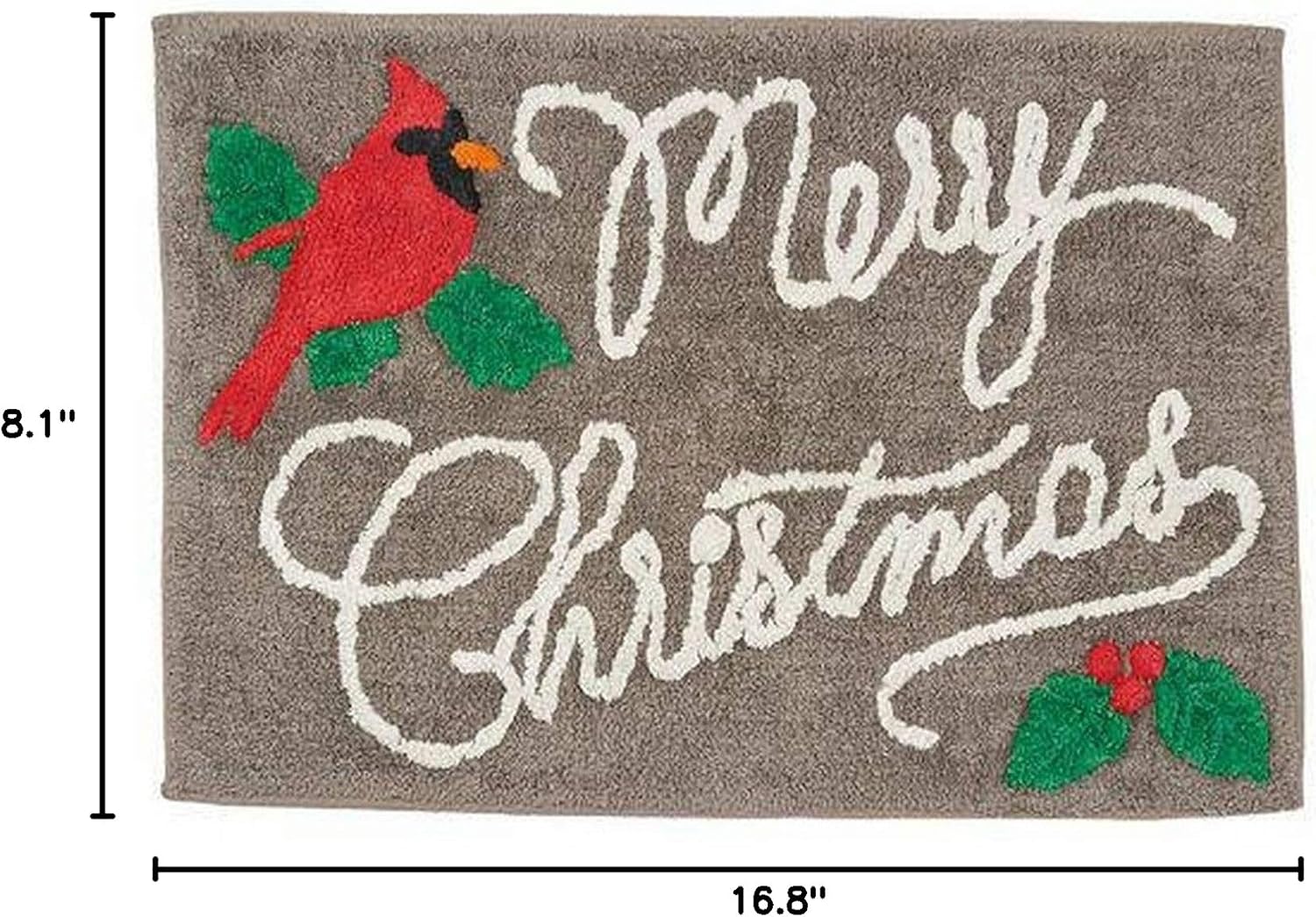 This pretty St Nicholas Square Christmas bath rug has a great look. It is gray in color with a red cardinal and "Merry Christmas" sentiments. It will make a great bath mat or accent rug. St Nicholas Square cotton bath rug Gray in color and accented with a red cardinal and "Merry Christmas" sentiments Great accent or bath mat Measures 20" by 30" Stitched back Made from 100% plush cotton pile Easy care machine wash Brand is St Nicholas Square