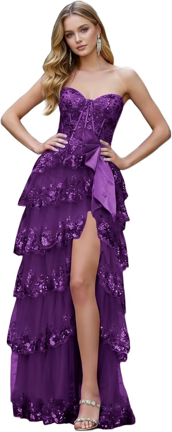 "Design : Laces Tulle Prom DressesFabric: TulleLength: LongSilhouette: A LineNeckline: SweetheartSleeve Style: SleevelessClosure: Drawstring BackTiered Laces Tulle Prom Dresses Strapless Ruffle Split Formal Evening Dresses with BowStrapless Tiered Laces Prom Gown with Bow Sparkly Tulle Evening Gown with Slit"