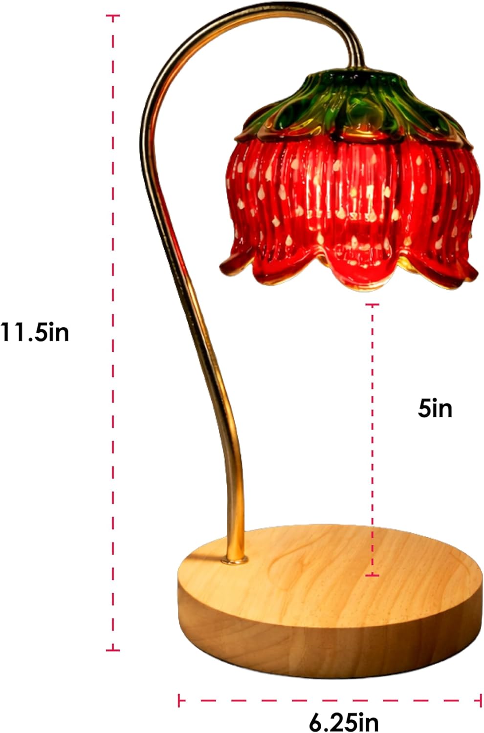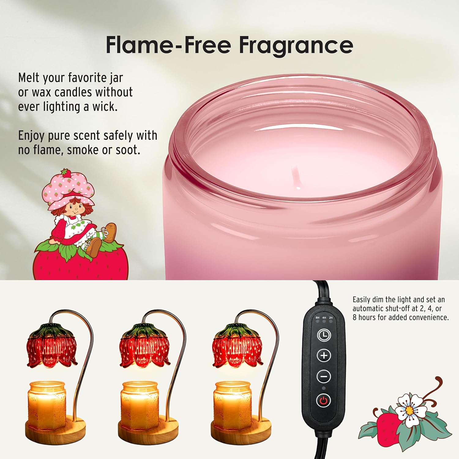 Bring sweet nostalgia and cozy ambiance into your space with this cute & stylish Strawberry Shortcake Candle Warmer Lamp. Designed to gently warm your favorite jar candles from above, this lamp releases fragrance without an open flame, soot, or smoke—making it a safer, cleaner way to enjoy your candles. Featuring an adorable strawberry-themed glass shade, an elegant gold metal pole, and a sturdy wood base, this warmer doubles as charming décor for bedrooms, offices, or vanity tables. The built-in timer (2, 4, or 8 hours) lets you set it and forget it, while the dimmable wall plug allows you to control both the brightness and the melt speed of your candle. Perfect for Strawberry Shortcake fans, Décor lovers, or anyone who wants cute and cozy way to enjoy their favorite candle scents.