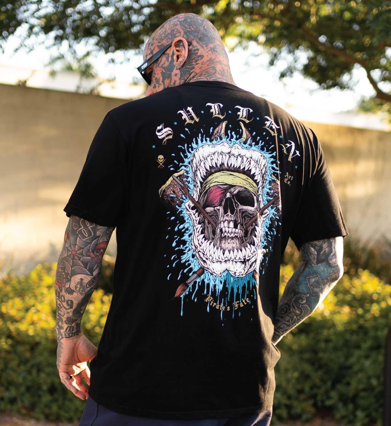 Hoist the sales and set to the open seas with the Sullen Pirate Day capsule for 2025. Unique hand drawn artwork in all its detail printed large on back and smaller on front of custom dyed premiume tee.