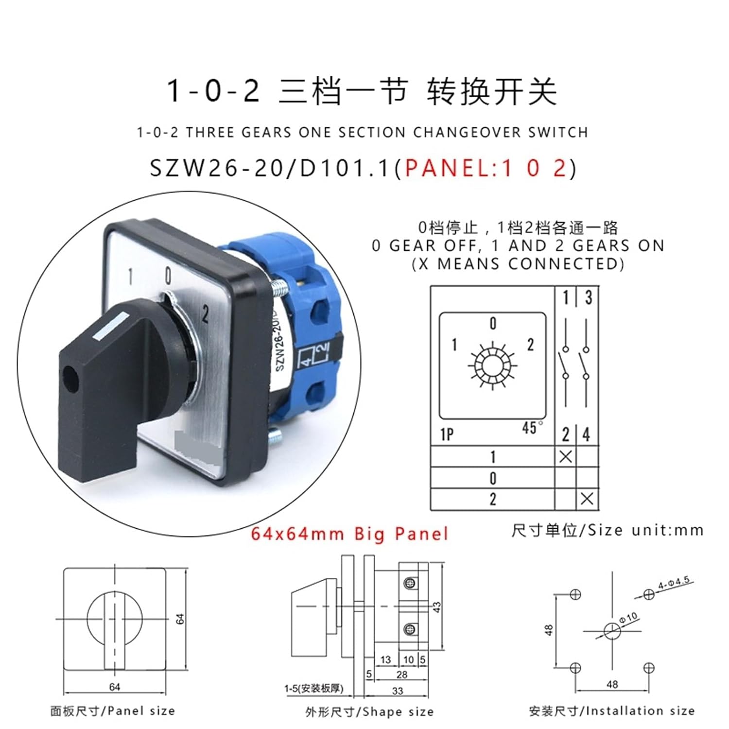 SwitcheSpecification:Lacthing Selector ; Ui: 660V, Ith: 20A ; 1 Phase 4 Terminals3 Position (1-0-2)3.Rating :AC-15: Ue 440V Ie 20ADC-13: Ue 240V Ie 1A4.Panel size:48 x 48 mm,Install Size:36 x 36mmPanel size:64 x 64 mm,Install Size:48 x 48mm5.which terminal will be connected in different position , please read the wiring diagram as a reference.Position 1 : 1-2Position 0 : All terminal disconnectedPosition 2 : 3-4 ==========High-concerned chemical : NoneCurrent : 20AMaterial : PlasticSwitch Type : Universal Switc Model Number : SZW26-20/D101.1 Item Type : SWITCHES Origin : Mainland ChinaCertification : CE,CCCRated insulation voltage(Ui) : 660VConventional heating current(Ith) : 20AUse category 1 : AC-15Rated working voltage(Ue) 1 : 440VRated working current(Ie) 1 : 20AUse category 2 : DC-13Rated working voltage(Ue) 2 : 240VRated working current(Ie) 2 : 1A