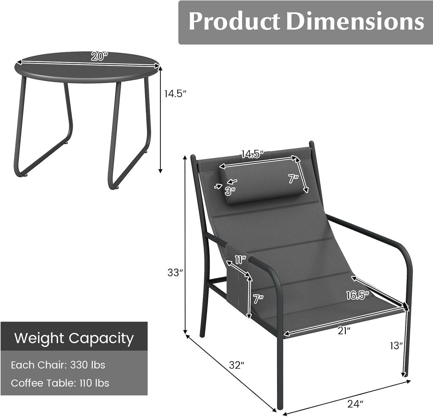 Description:Experience ultimate comfort with this 3-piece ergonomic bistro chair and table set.Each chair features contoured sling seat with padded sponge layer and breathable fabric, complemented by an elastic headrest for enhanced comfort. The sturdy metal frame supports up to 330 lbs per chair, while the matching coffee table can hold up to 110 lbs. Complete with a side storage pocket, the chairs will make you relax with more convenience. With elegant appearance and high-level comfort, this set is ideal for your patio, backyard or poolside. Enjoy relaxing outdoors with this stylish and comfortable furniture set.Features:Contoured seat design makes you fully relaxedElastic headrests enhance comfort, detachable when unusedSponge-filled seats ensure optimal cozinessSkin-friendly and breathable seat fabric increases comfortHeavy-duty metal frame offers great stabilitySide storage pocket conveniently holds essentialsCoffee table brings you more convenience to fetch itemsSuitable for backyard, poolside, front porch and so onSpecifications:Color: GrayMaterial: Metal, FabricDimension of Chair: 32” x 24” x 33”/82 x 61 x 84 cm (L x W x H)Dimension of Coffee Table: 20” x 14.5”/50 x 37 cm (Dia x H)Dimension of Headrest: 14.5” x 7” x 3”/37 x 17 x 7 cm (L x W x Thickness)Dimension of Pocket: 11” x 7”/28 x 18 cm (L x W)Weight Capacity of Each Chair: 330 lbs/150 kgWeight Capacity of Coffee Table: 110 lbs/50 kgNet Weight: 30 lbs/13.5 kgPackage Includes:2 x Patio Chairs1 x Coffee Table1 x Instruction