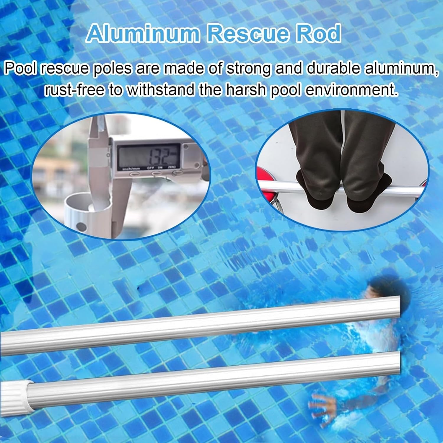 Enhance the safety of your swimming area with our premium pool rescue pole, a must-have accessory for both pool owners and lifeguards. Crafted from robust aluminum alloy, this durable tool is designed for quick and effective rescues, ensuring that you can respond swiftly in emergency situations. Its striking blue color not only adds a stylish touch but also ensures high visibility, allowing for immediate identification during critical moments.Key Features:- Constructed with a strong aluminum alloy for enhanced durability.- Ideal for emergency rescues, making it essential for pool safety.- Telescopic design allows for adjustable lengths, accommodating various needs.- Compatible with multiple attachments, increasing versatility.- Perfect for both public and private pool settings.- Lightweight design ensures easy maneuverability for quick actions.- Snap-lock mechanism provides quick adjustments, ensuring readiness at all times.- Built to withstand harsh aquatic environments, ensuring longevity.- Supports fast and effective rescues, trusted by safety professionals worldwide.Specifications:Material: Aluminum AlloyAvailable Sizes:- 100 cm/39.4 in: - Telescopic Range: 0.63m-1m (24.8'' - 39.4'') - Starting Length: 0.63m (24.8'') - Pulling Weight: 250kg (551lb) - Sections: 2 - Pipe Diameter: 3.2cm (1.25'')- 300 cm/118.1 in: - Telescopic Range: 1.21m-3m (47.6'' - 118.1'') - Starting Length: 1.21m (47.6'') - Pulling Weight: 250kg (551lb) - Sections: 3 - Pipe Diameter: 3.2cm (1.25'')- 500 cm/196.9 in: - Telescopic Range: 1.82m-5m (71.7'' - 196.9'') - Starting Length: 1.82m (71.7'') - Pulling Weight: 250kg (551lb) - Sections: 3 - Pipe Diameter: 3.2cm (1.25'')Package Includes:1 x Pool Rescue Pole
