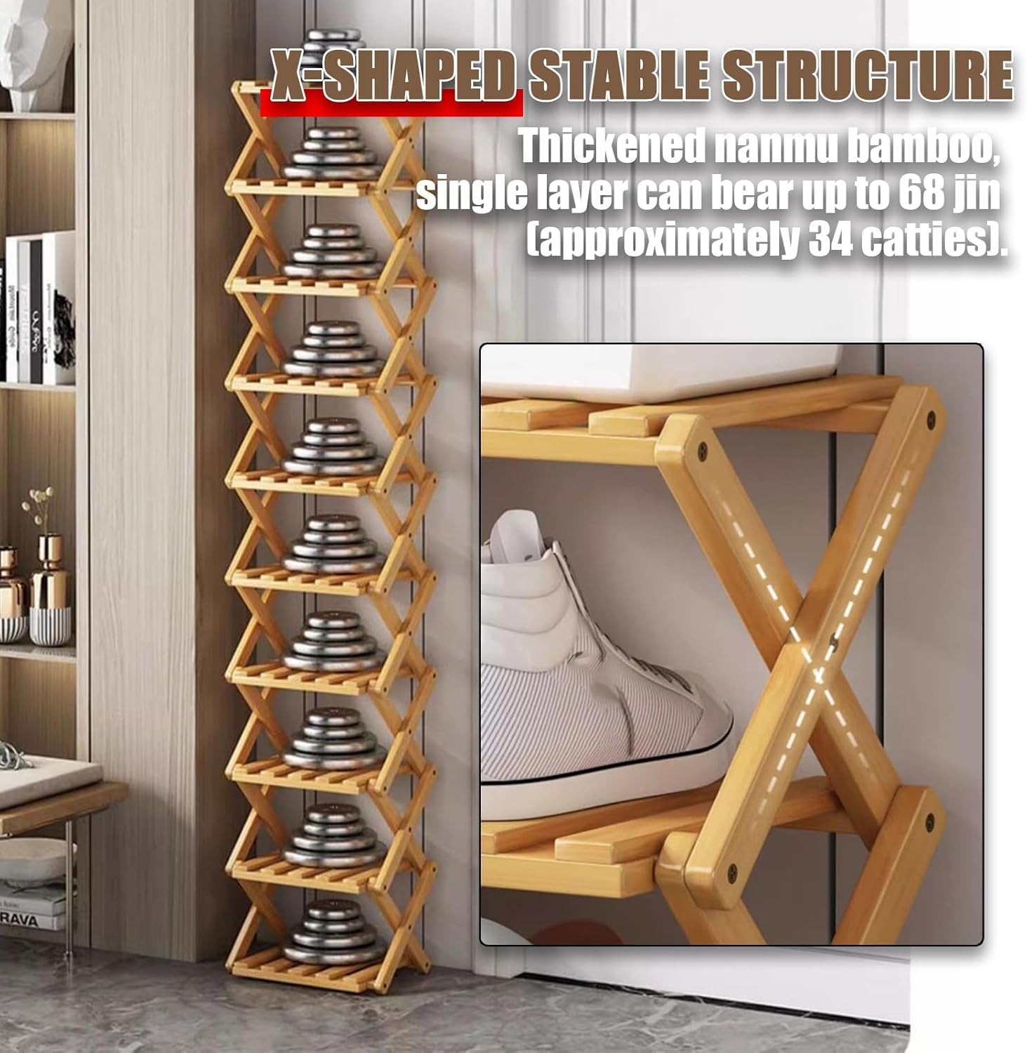 6 Tiers Bamboo Shoe Rack - No Assembly Required, Tall Narrow Foldable Shoe Organizer, Space-Saving Multifunctional Shelf for Entryways, Corners, Bedrooms, Balconies About this shoe rack: Extremely sturdy 1: No-assembly design—ready to use right out of the box; 2: Bamboo construction for natural health benefits; 3: Thick, durable materials effortlessly support over 40 lbs; 4: Vertical design saves space, perfect for dorm rooms, corners, and other compact areas; 5: Wider and taller design accommodates various shoe shapes and larger sizes; 6: Multi-functional use—stores shoes and also holds books, folders, small potted plants, and more. Name: 9 tier bamboo shoe rack Type: Folding Folding Shoe Rack Material: Bamboo Color: Wood/Brown Installation Requirements: No installation required Note: 1. Due to manual measurement, please allow 1-5g/1-2cm error. 2. Due to differences in monitors and lighting, the image may not reflect the actual color of the item. Thank you for your understanding.