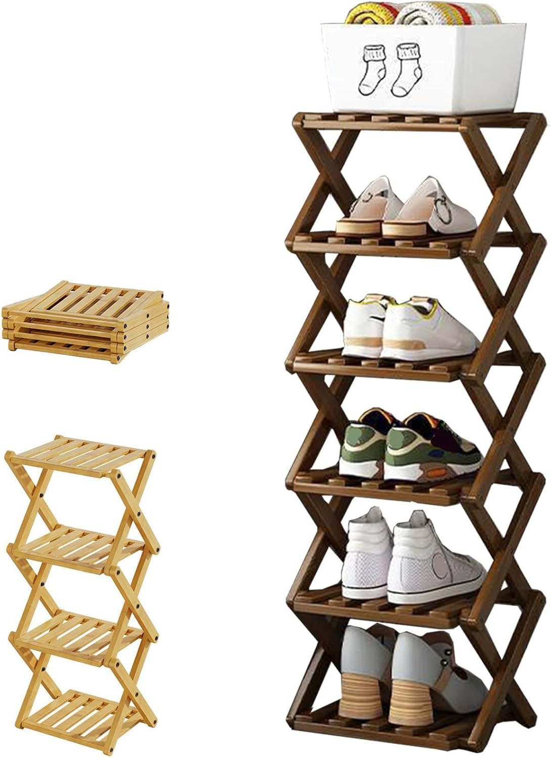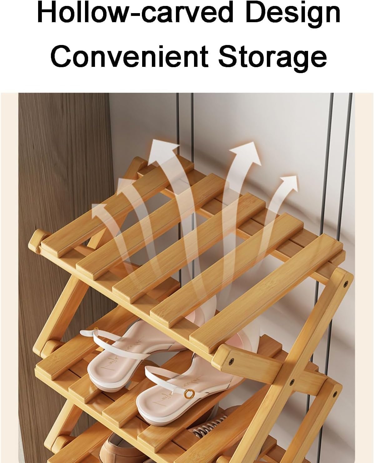 Features: 1. No Assembly Required – Unfolds and locks in seconds, no tools needed 2. Space-Saving Design – 26cm/10.24inch wide profile fits anywhere 3. Nan Bamboo Build – Durable, smooth finish, and visually warm 4. Strong & Stable – X-frame design 5. Flat-Folding Storage – Stores as thin as a yoga mat 6. Easy to Clean – Wipe and go maintenance 7. Multi-Purpose Use – For shoes, books, plants, and more Specifications Product Name: Folding Multi-Tier Organizer Rack Material: Nan Bamboo Color: Brown, Natural Dimensions: Width 10.24 in / 26 cm (varies by tier/height option) Care: Wipe clean with a damp cloth Tiers: 3/4/5/6/7/8/9 fixed shelves Use Scenarios: Entryway, closet, apartment, hallway, bedroom, bathroom, pantry Note: 1. Dimensions may vary slightly due to manual measurement. 2. Color may appear different due to lighting and screen settings. 3. For indoor use; avoid prolonged exposure to rain or high moisture. 4. Weight capacity is per tier; distribute items evenly for best stability. Vertical Shoe Organizer for Small Spaces, Space-Saving Multifunction Storage Rack, No Assembly Narrow Shoe Shelf for Entryway Closet Dorm