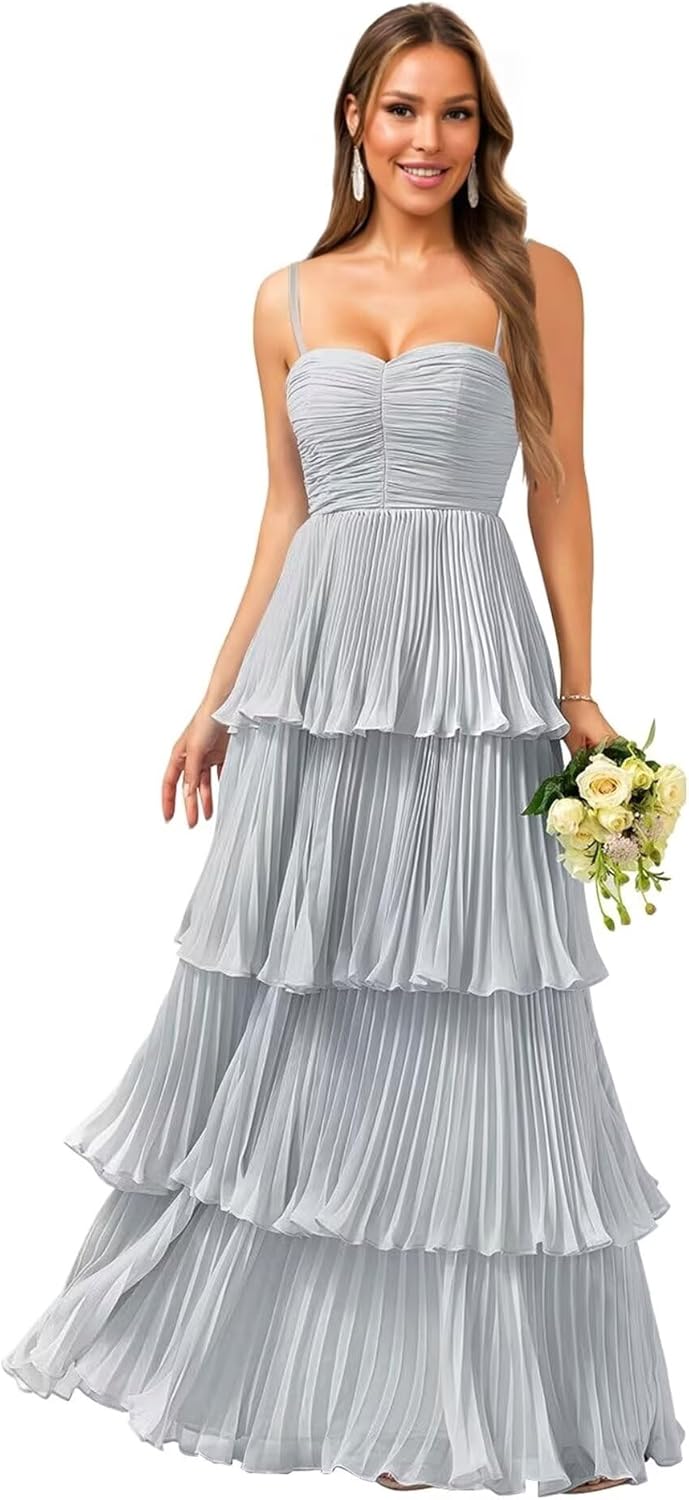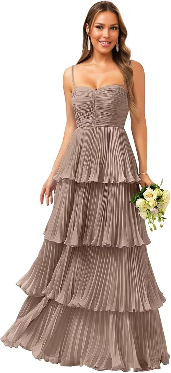 Tiered Ruffle Bridesmaid Dresses for Women Spaghetti Straps Long Chiffon Formal Evening Prom Gowns