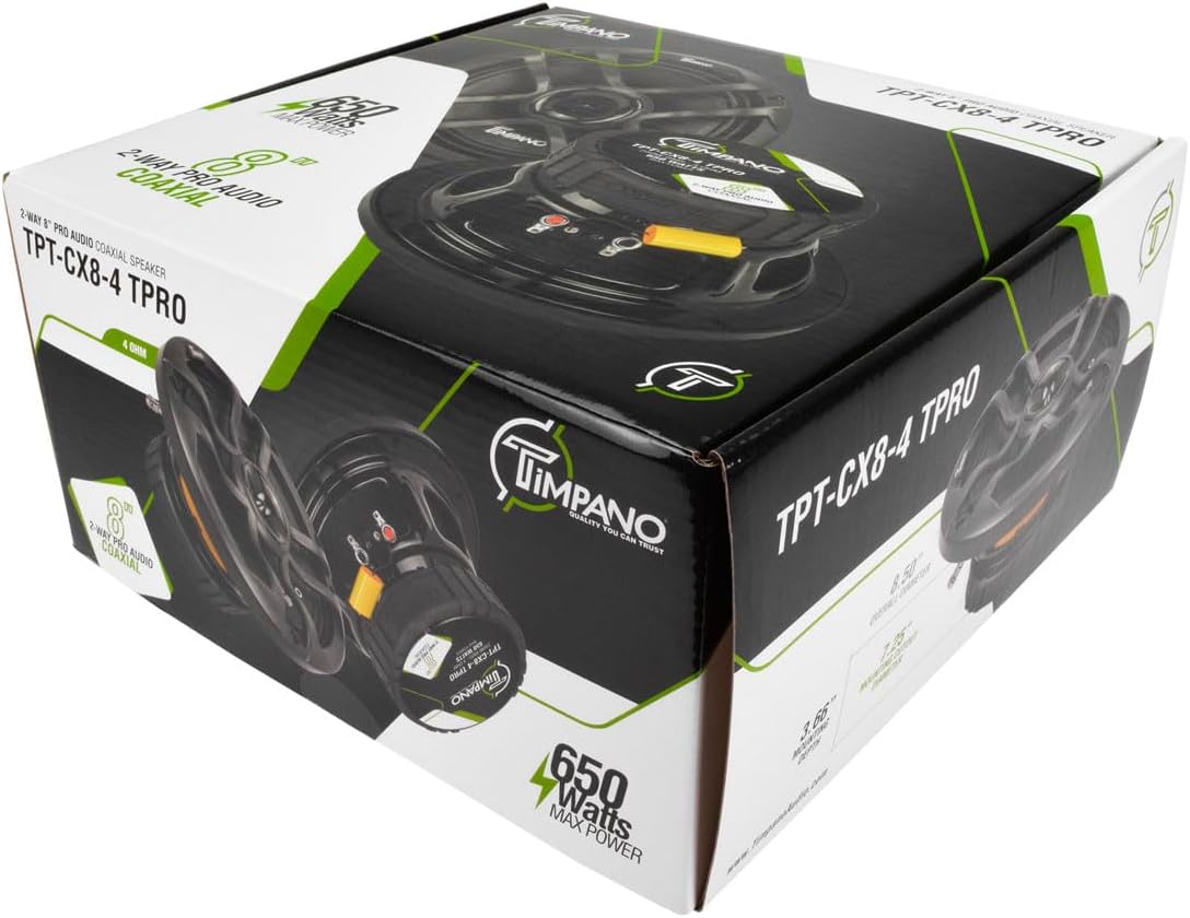Listen to music to a whole new level with a PAIR of TPT-CX8-4 PRO, a 8″ 2-Way Coaxial, that is basically a PRO Audio full-range loudspeaker combo.This pro midbass speaker has an impressive punch combined with its bullet tweeter. It responds from 70 to 20,000 Hz and gives your system a new quality of sound.125 Hz under 325 Watts of Amplifier RMS Power with 18dB Slope120 Hz under *250 Watts of Amplifier RMS Power with 12dB Slope(*Maximum power handling using a regular car audio amplifier crossover)