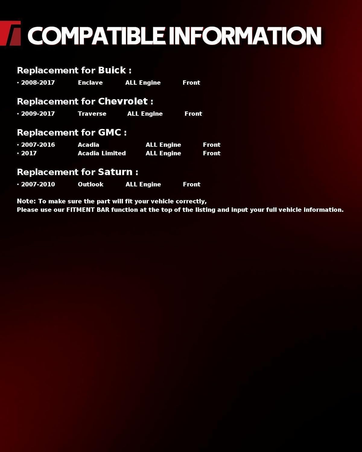 | Manufacturer Warranty Description | NOTE: Please check with the "Amazon Confirmed Fit" or the detailed fitment info in the production description below to make sure that is the correct part for your vehicle |