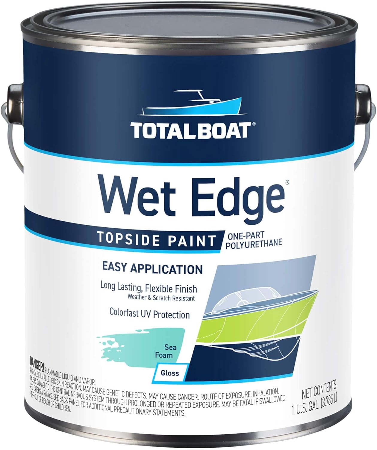 TotalBoat Wet Edge Topside Marine Boat Paint is an easy-to-use, 1-component, polyurethane marine grade paint that provides a beautiful, brilliant, resilient, high-gloss finish on hulls, cabin tops, consoles and other topside surfaces above the waterline. Use on fiberglass, wood, metals and previously painted surfaces in good condition. Provides excellent weather resistance so the finish retains its superior color quality and gloss. Once cured, the extremely durable finish will not fade, lift, crack, or peel. The high-solids content in Wet Edge makes it look better and last longer. It's also why you need to apply thin coats - 2 to 3 coats are all you need for long-lasting beauty and shine. Wet Edge gives you the high gloss and durability of a 2-part polyurethane without all the hard work. It's very easy to apply, has excellent flow out, and dries perfectly smooth. For best results, prime bare wood or previously painted surfaces with TotalBoat Premium Topside Primer. Use TotalBoat Dewaxer & Surface Prep as a solvent wipe to remove grease, oil and other contaminants. Wet Edge may be thinned with TotalBoat Special Brushing Thinner 100 (brush/roll application) or xylene (spray application). Application temperature is 50-90 degrees F. Wet Edge is also compatible with non-skid additives and flattening agents for 1-component polyurethane paint. Compare Wet Edge marine paint for fiberglass boats to Interlux Brightside Polyurethane, Pettit Easypoxy and Pettit EZPoxy, Rustoleum Marine Topside Paint, Duralux Marine Paint and Epifanes Monourethane. Wet Edge offers superior durability, color retention, gloss retention, and weather resistance, which also makes it an ideal canoe paint, kayak paint, camper paint, rv exterior paint, or golf cart paint. For an excellent aluminum boat paint, use TotalBoat Aluminum Boat Topside Paint. All TotalBoat products are developed for boaters by boaters, to provide great value and great results. 100% made in the USA.