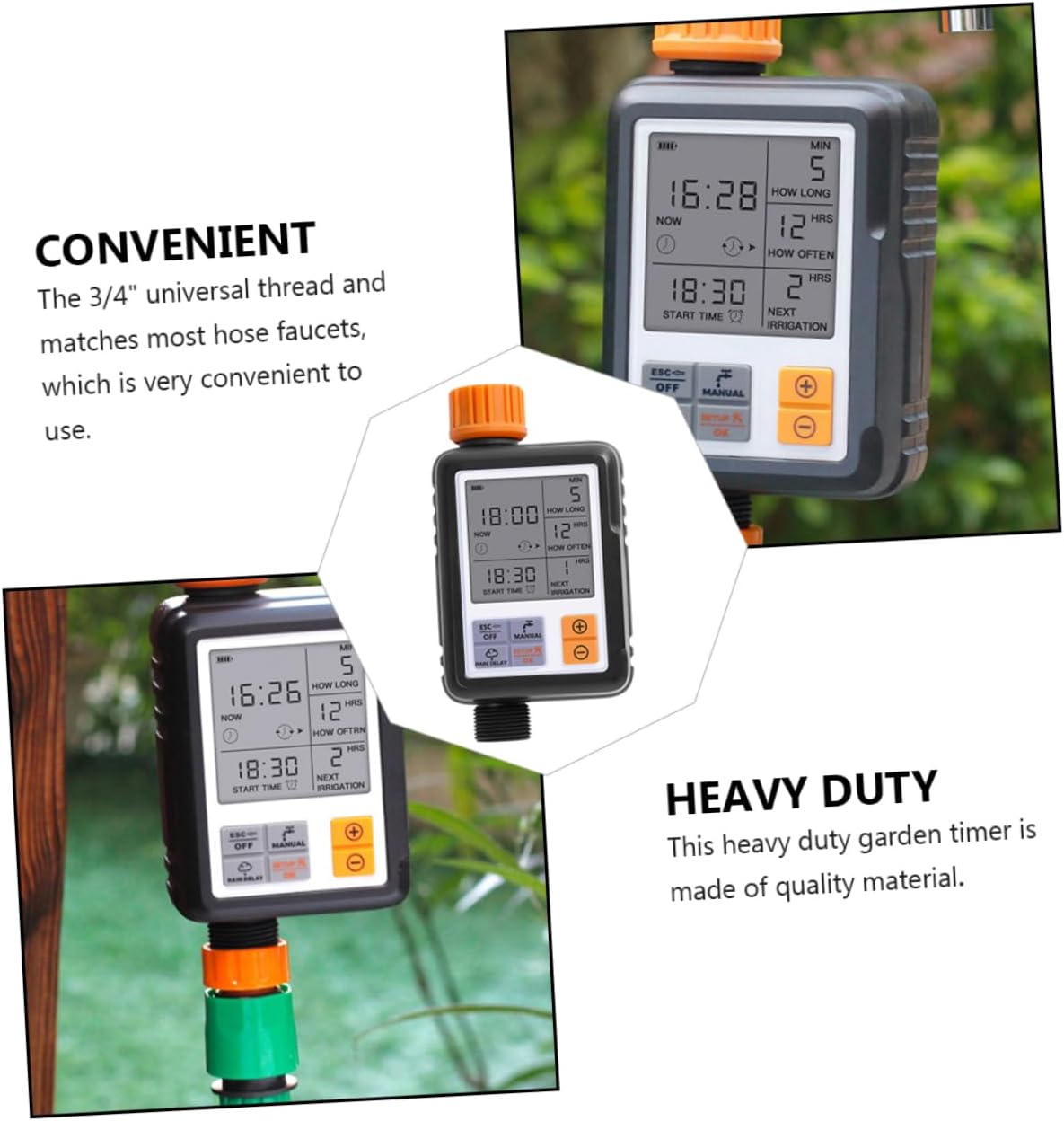 Package List 1 set x automatic water timer kit Characteristics -Water Inlet: 3/4" internal thread Garden Watering Timer. -Size: About 16.00X5.50X8.00cm/6.29X2.16X3.14in Digital Irrigation Timer. - Battery: 2 x AA batteries(Not included) Irrigation Timer. -Color:Black Irrigation Controller -Material: Plastic Gardening Watering Timer. -Water Outlet: 3/4" outer thread Automatic Watering System. - This automatic irrigation timer can be used for watering lawns, flowers, plants and pots in gardens, vegetable gardens, patios, etc. Timing Watering Device - The screen will auto off in 30s of no button operation to battery life Digital Watering Timer. - It’s also applicable in sprinkling and drip irrigation systems, rain buckets, pet water feeding, etc. Digital Water Timer - Built-in lock function prevents water waste and destroyed watering plan caused by mistaken trigger Irrigation Watering Timer. - The large LCD display makes it more interactive and easy-to-read. Watering DeviceGoods InformationGarden Watering Timer A automatic watering timer, made from material, is and for long time use.Irrigation Timer for garden and home use.Gardening Watering Timer one of for you.Digital Irrigation Timer Can adjust the watering time to meet the needs of different flowers