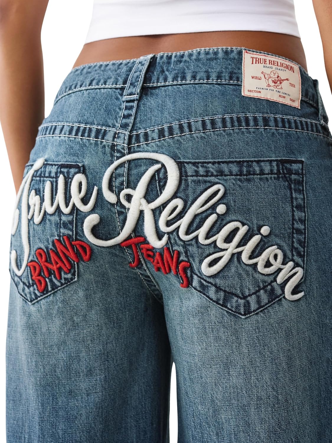 True Religion Women's Embroidery Jessie Super Baggy Jeans. These ultra-relaxed jeans are designed for a fashion-forward silhouette, featuring an oversized fit that delivers comfort and statement appeal. Embroidered detailing adds signature flair, while the premium denim fabric ensures durability and effortless wear. Perfect for streetwear vibes or casual everyday styling, these jeans bring True Religion's rebellious spirit to life.Attributes: Brand: True Religion Style Name: Jessie Super Baggy Fit: Relaxed Design: Embroidered logo and detailing Rise: Mid-Rise Closure: Zip fly with button Care: Machine washable