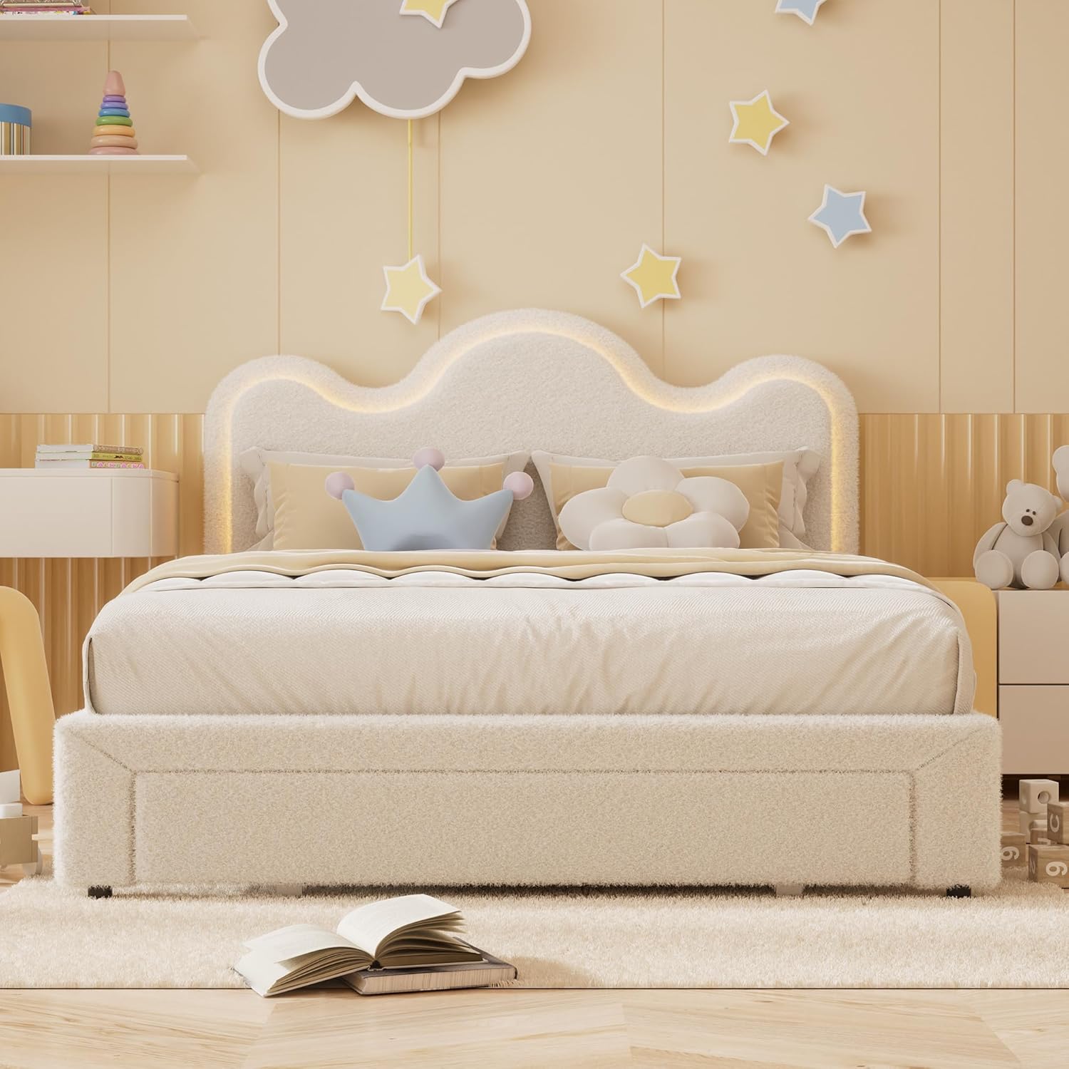 • [Elegant Design] - The headboard features an exquisite floral design, paired with sherpa fabric to provide a cozy and luxurious sleeping experience. LED lights create a romantic ambiance for a peaceful night's rest. The graceful silhouette of the floral element, accompanied by the soft LED illumination, brings a touch of chic and understated elegance to your sleeping area. This bed effortlessly combines striking visual appeal with practical usability, making it an essential addition to enhance.