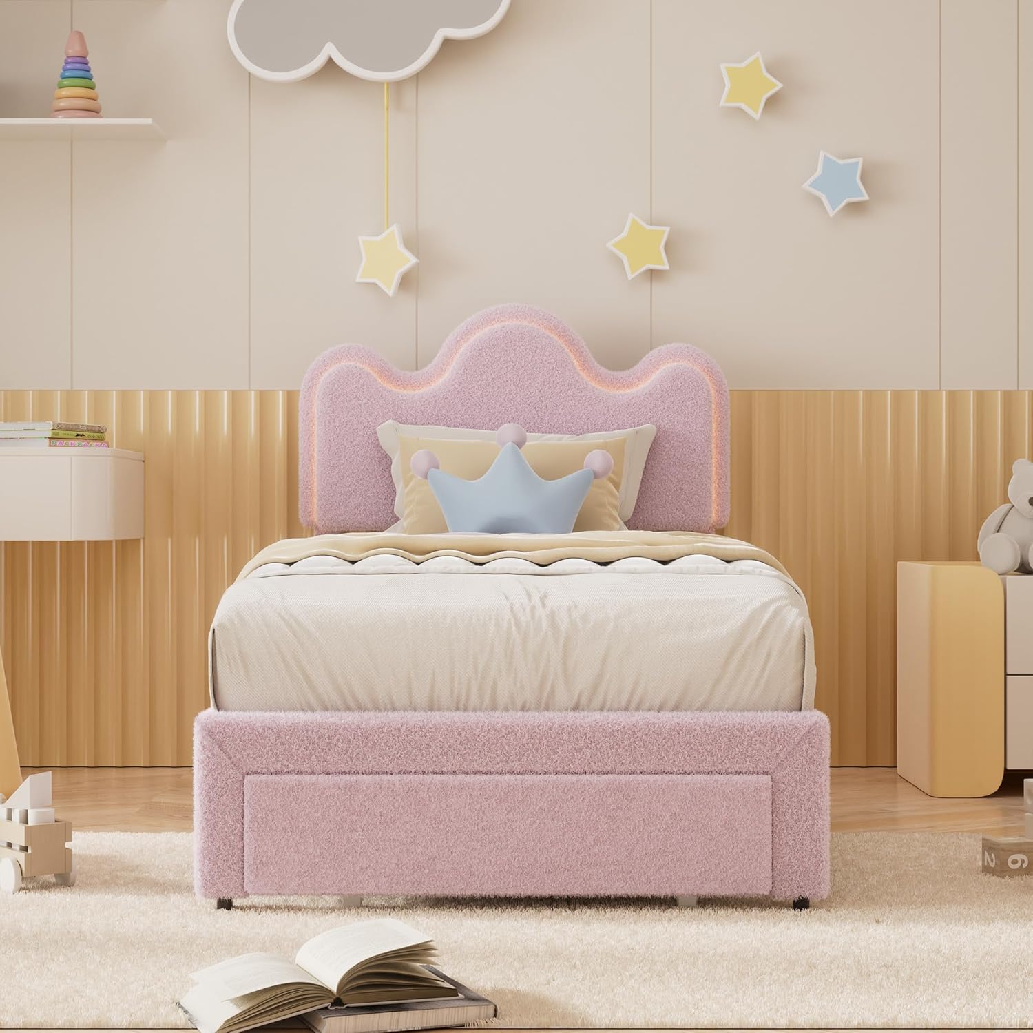 Twin Upholstered LED Bed Frame with Storage Drawers Girls Bed with Flower Headboard Boucle Princess Platform Bed Frame for Kids/Girls Strong Wood Slat Support,No Box Spring Needed,Easy Assembly