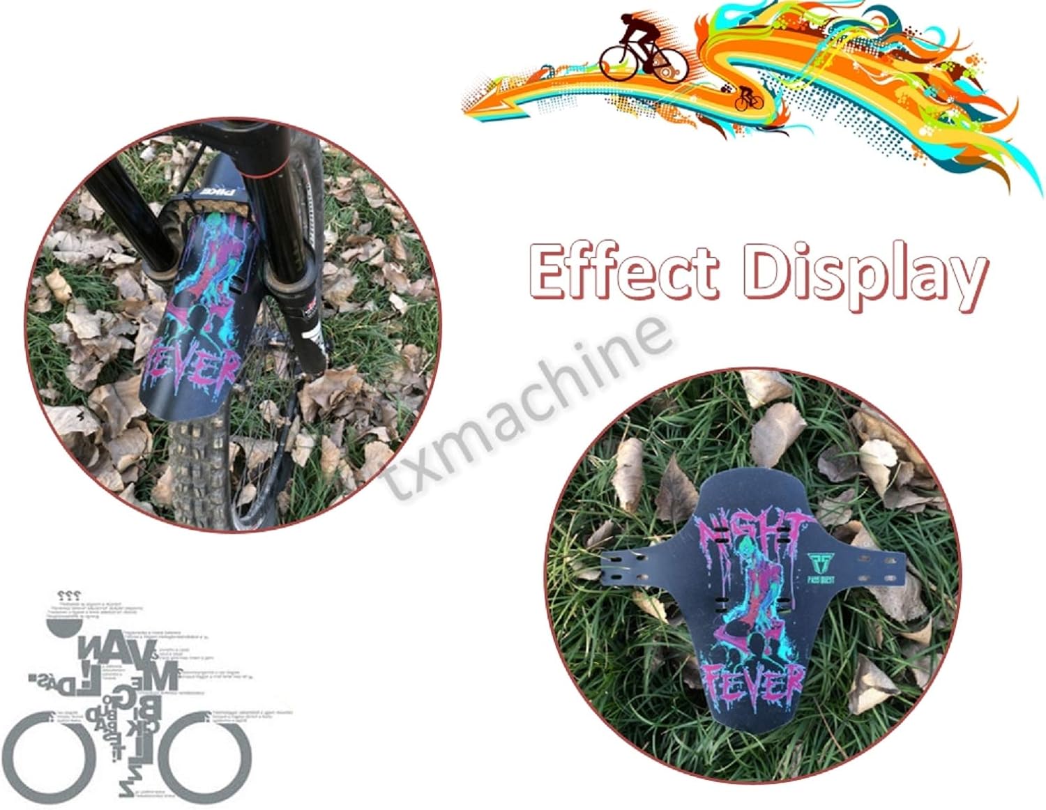 Specification: Weight: 28g 4 colors:colorful,purple ,Red ,black Size: 12.2*10.6 in (310*270mm) Material: PP Thickness:0.03in (0.8mm) Feature: 1.With 10pcs cable ties 2.Perfect fender for any 26/27.5/29inch Mountain Bike. 3.Suitable for bike model:AM,DH,FR,ENDURO 4.Easy to install and remove, fit for mountain bike. 5.Lightweight,sturdy,cool design. 6.The most powerful bike front fender. 7.Its extremely durable and protects your suspension fork seals 8.Installation Position Reference”The mounting hole is designed as rectangle, which is more convenient for assembly and adjustment 9.With reference line, easy to cut 10.Both front and rear ends can be used 11.Multiple styles available:Use it,you will not be afraid of muddy roads,Keep the dirt and water far away your face 12.Super toughness, can be free deformation Application: It can fit perfectly in most of bike,such as mountain bike,road bike and more. Package included: Bike fender*1pcs Manual*1pcs Cable ties*10pcs