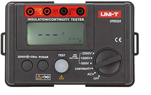 Features:DAR: PI: Auto Range: Low Battery Indication: LCD Backlight: Alarm Light Display: Alarm Buzzer: High Voltage Indication: Over Load Indication: Auto Disharge: Test Voltage Vice Display: Specifications:Model: UT502AInsulation Resistance(): Test Voltage: 500V/1000V/2500V 0%~10%500V: 0.00M~99.9M (3%+5) ; 100M~5.5G (5%+5)1000V: 0.00M~99.9M (3%+5) ; 100M~5.5G (5%+5)2500V: 0.00M~99.9M (3%+5) ; 100M~9.9G (5%+5) ; 10.0G20.0G (10%+5)Load Current: 500V(R=500K) 1mA 0%~10% ; 1000V(R=1M) 1mA 0%~10% ; 2500V(R=2.5M) 1mA 0%~10%Short Circuit Current: <2mACONTINUITY(): Test Voltages: about 5.0V (2%+3) ; 0.01~200 (2%+3); Max Current: >200mAAC Voltage (V): 30V~750V (2%+3)General Characteristic:Power: 6 * 1.5V Alkaline Batteries (not included)LCD Size: 65mm x 27mmProduct Net Weight: 500 gProduct Size: 150mm * 100mm * 71mmProduct Color: Red and GreyPackage Size: 18.5 * 15 * 9cm / 7.3 * 5.9 * 3.7inPackage Weight: 757g / 1.7lbPackage List:1 * UT502A Insulation Resistance Meter1 * Pair Test Lead1 * Pair Alligator Clips1 * Carrying Bag1 * English Manual