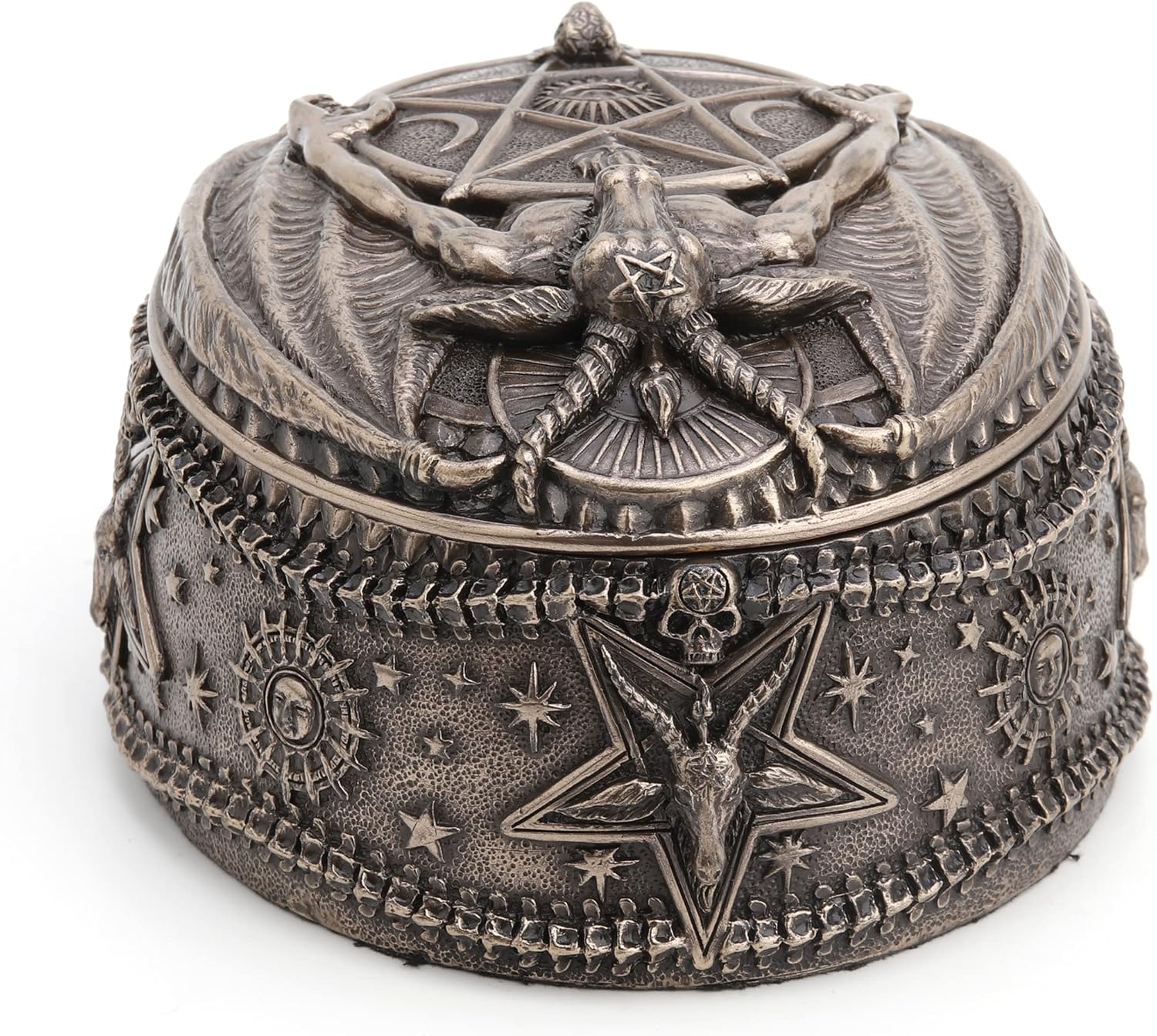Beautifully designed mark of the beast Baphomet oval trinket box, made with high quality designer resin and cold cast bronze technique.