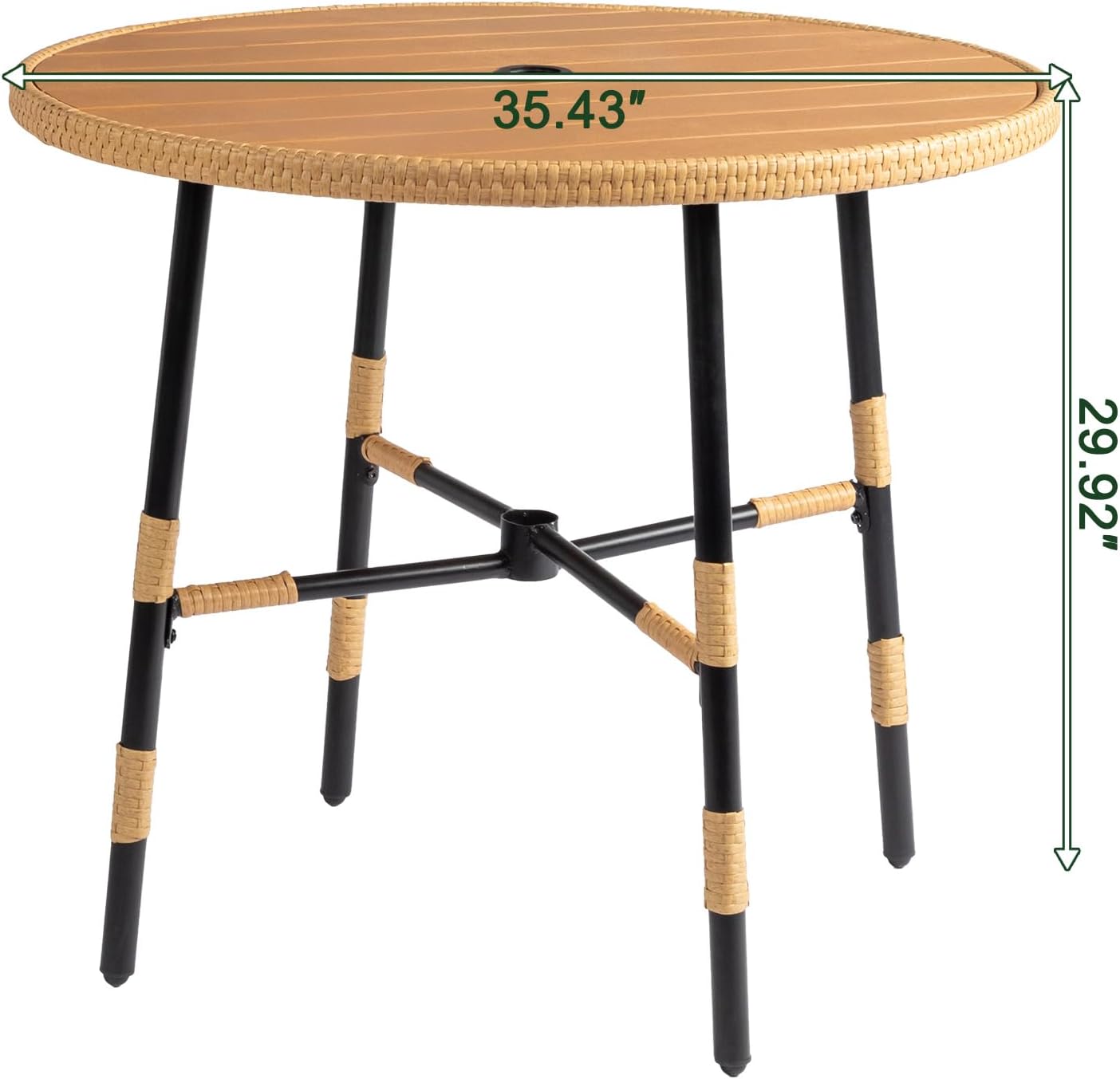 【Product Overview】The VINGLI 35.4-inch round patio dining table combines functionality with boho-chic aesthetics. Featuring a textured WPC tabletop that mimics real wood without maintenance hassles, this outdoor table is enhanced by intricate wicker detailing along the edges. The built-in umbrella hole (2" diameter) lets you add shade for alfresco dining.【Key Features】 4-Point Stabilization System: Thickened Steel legs with anti-slip pads Space-Saving Design: 35.4" diameter fits 4-6 chairs comfortably Low-Maintenance Surface: Wipe clean with damp cloth, no sealing required【Where to Use】Ideal for poolside barbecues, garden tea parties, apartment balconies, RV camping, and cafe outdoor seating areas.