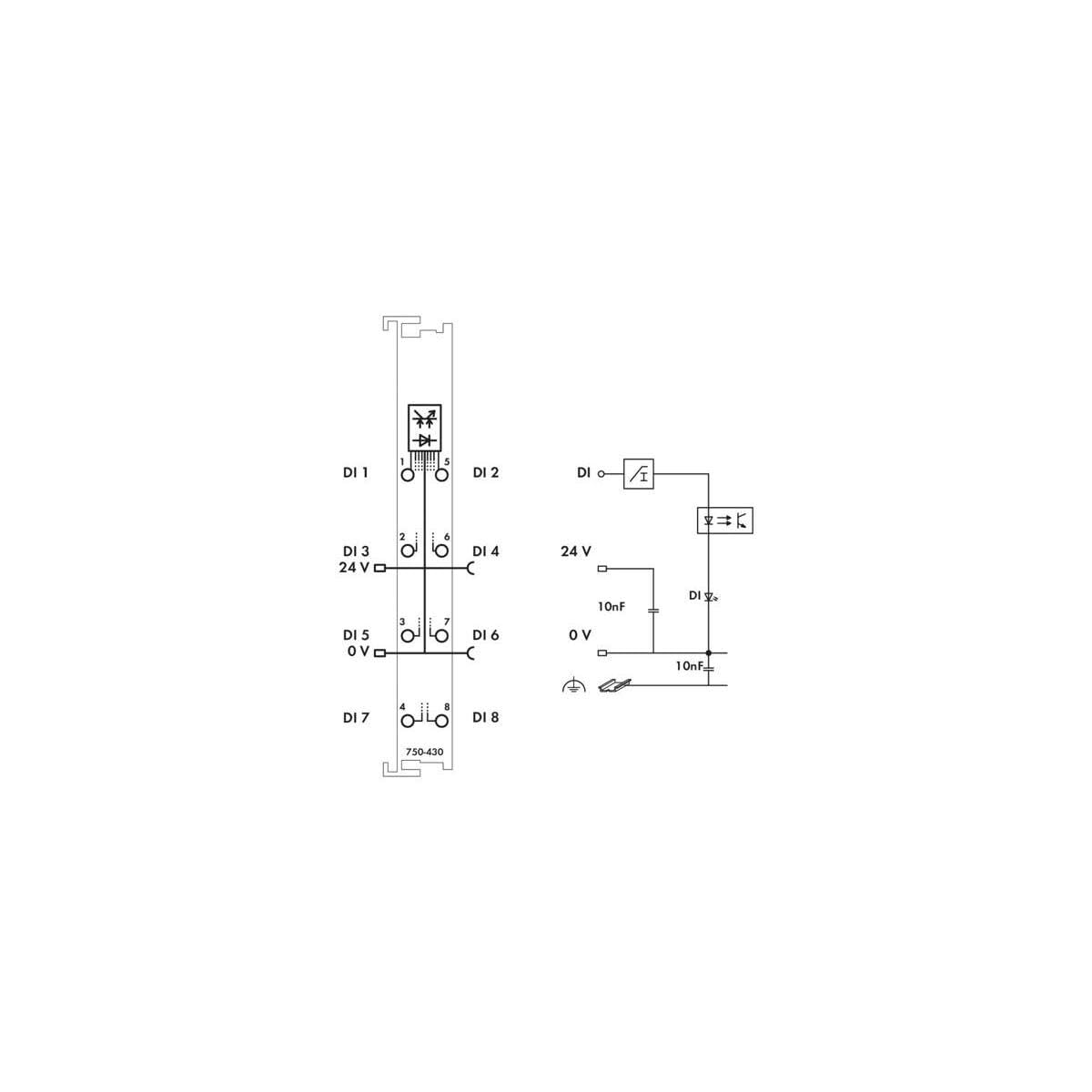 24VDC, 35 DIN RAIL. IP20, 3MS INPUT FILTER, 8 DIGITAL INPUTS, 8-CHANNEL, INPUT MODULE; Part Number: 750-430; Category: PLCs/Machine Control; Subcategory: VDC Logic I/O Module