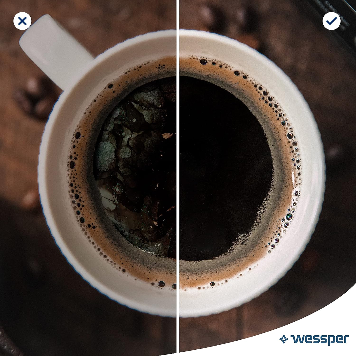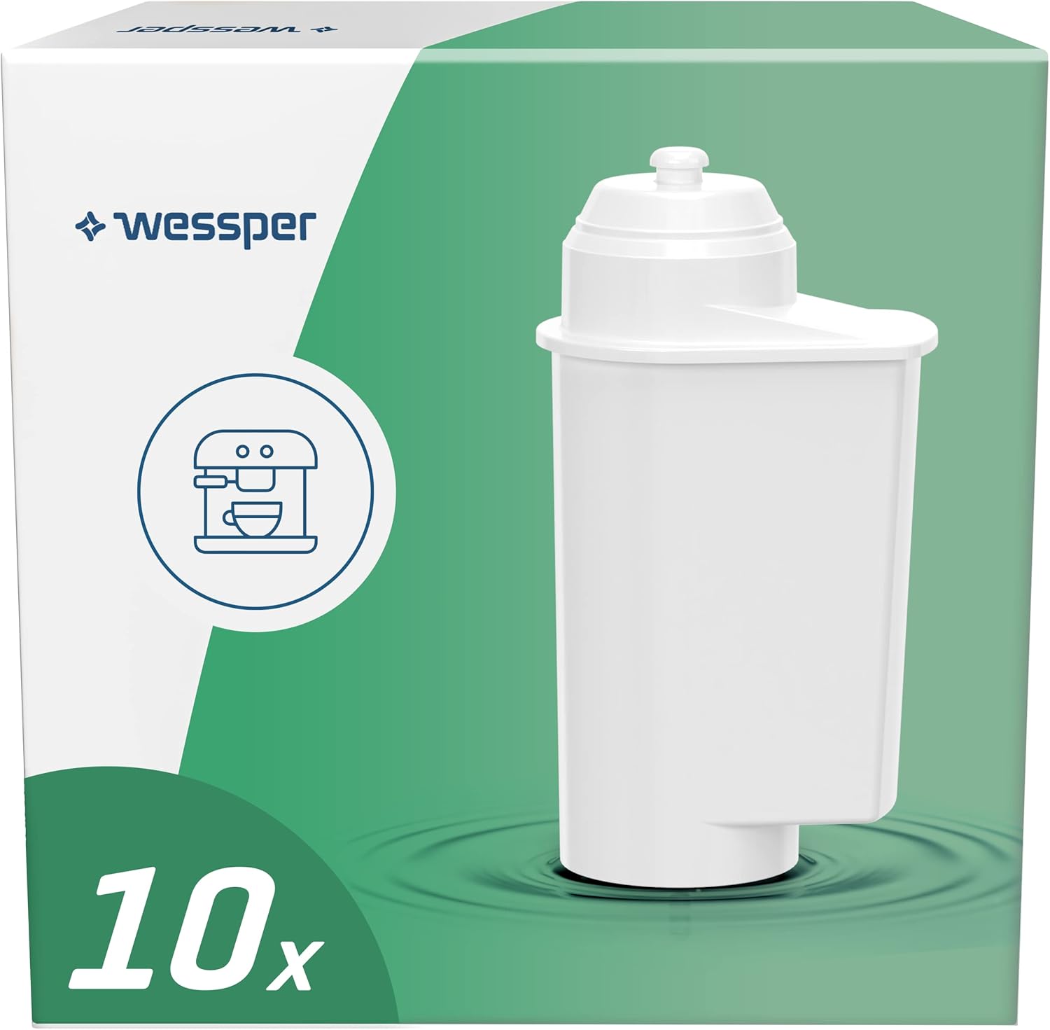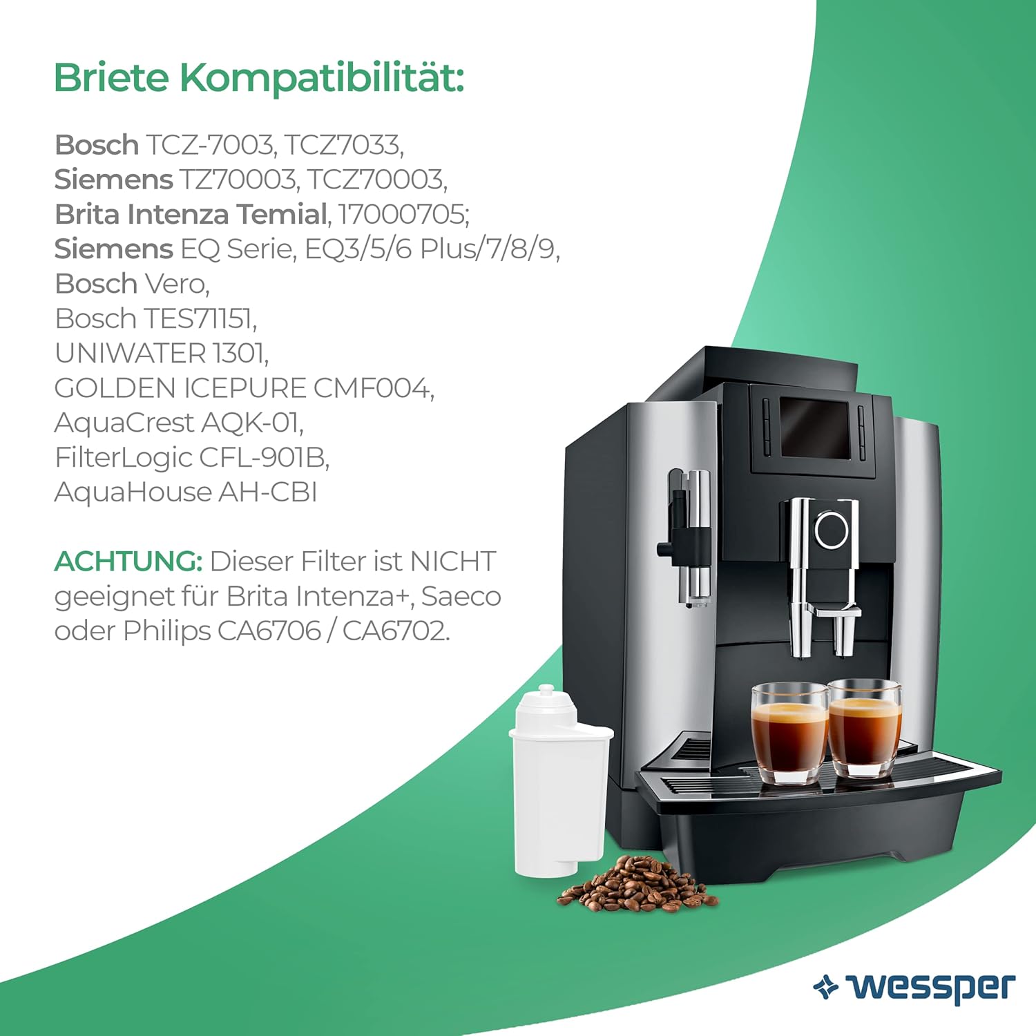 The Wessper Aquaintence water filter can be used as well as the Brita Intenza filter cartridge for Siemens / Bosch / Neff / Gaggenau / Panasonic coffee machines. Its design and new attachment make it compatible with such series: Bosch TCZ-7003, TCZ7033, Siemens TZ70003, TCZ70003, Brita Intenza Temial, 17000705; Siemens EQ Series, EQ3/5/6 Plus/7/8/9, Bosch Vero, Bosch TES71151, UNIWATER 13 01, GOLDEN ICEPURE CMF004, AquaCrest AQK-01, FilterLogic CFL-901B, AquaHouse AH-CBI The filter consists of: SILVER IMPREGNATED ACTIVE CARBON - Removes pesticides, herbicides, chlorine and detergents through absorption and catalytic reduction. Noticeably improves the smell and taste of the water. Ionomatic resin – removes excess magnesium and calcium ions and thus eliminates water hardness. It cleans the water perfectly, but does not remove all minerals, so you can make a tasty and aromatic coffee. Put the filter into the water tank and then activate the filter cleaning function.