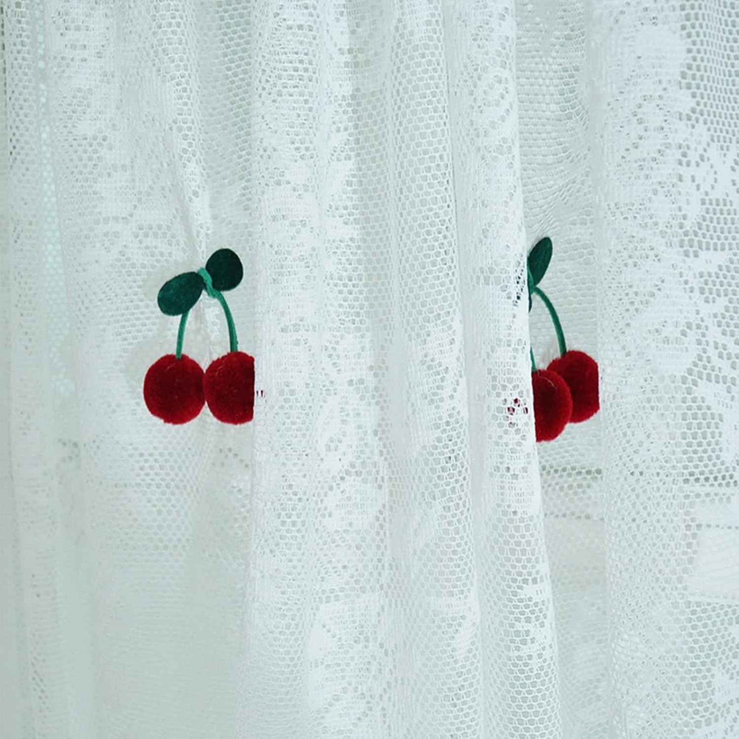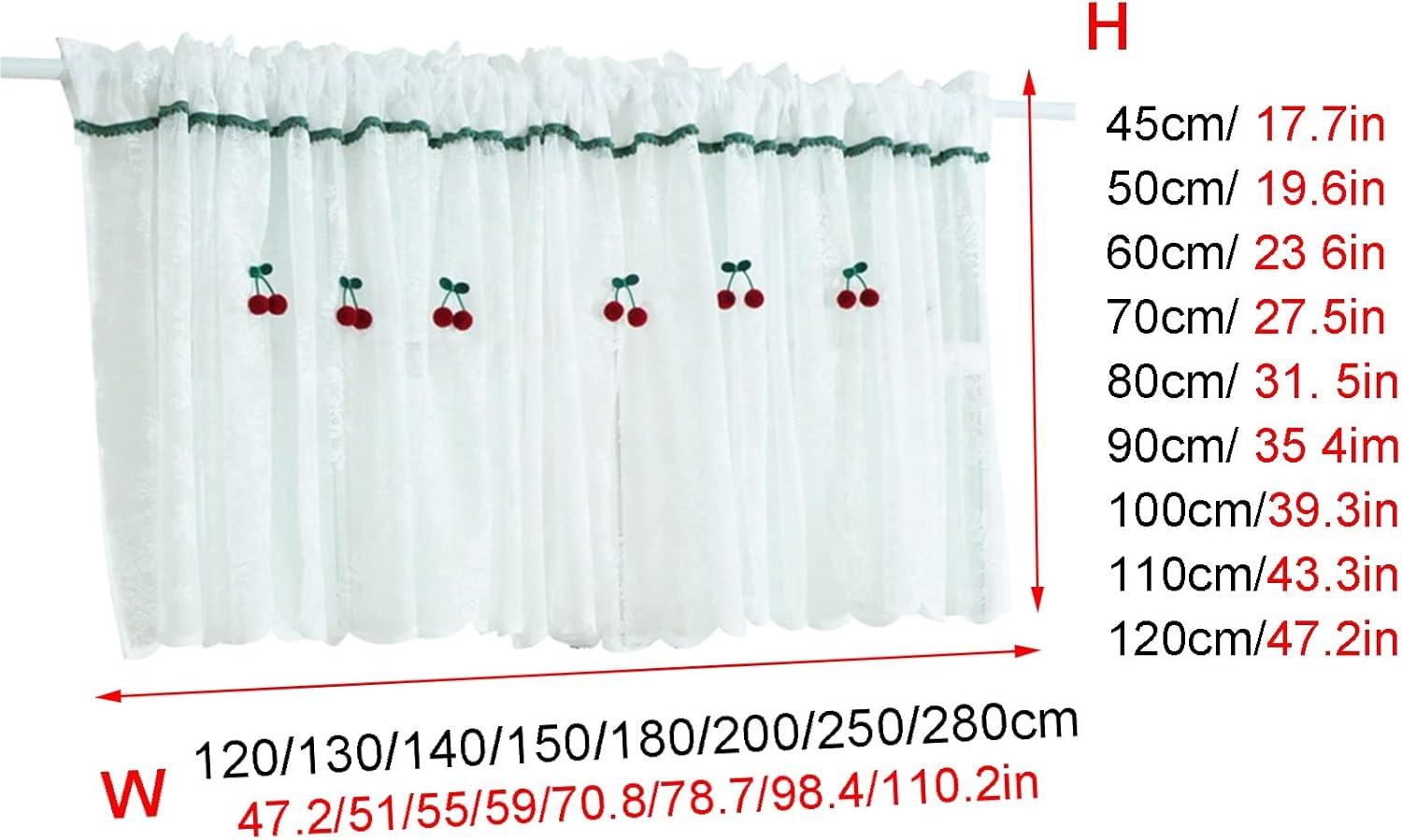 ❅ Stylish cafe curtains woven from lace, giving an elegant and light feel, the fluffy texture will mesmerize you, suitable to add glamour to any room decoration.❅ The lovely cherry decoration brings a touch of freshness, the style is simple and beautiful, and it perfectly shows your refined taste.❅ This little curtain lets sunlight through during the day. The light falling from the weave, in a unique haze, will remind you of a beautiful fantasy.❅ Rod pocket curtains make it easier for you to install on your curtain rod. Flexibility to fit various sizes of windows.❅ Kitchen curtains/Bedroom curtains/Living room curtains/Cafe curtains/Basement curtains/Wardrobe curtains❅ Specifications* Product Name: lace curtain cherry half curtain* Material: Lace* Style: Modern fresh style* Size (WxH): Width and height can be customized* Use place: Cabinet, small window, cupboard, interior door.* Care instructions: Machine washable at 30℃ or below* The package includes: 1 short curtain (not including the rod)❅ Tips* The size is measured by hand, there may be 1-3 cm error.* For proper padding, the panel should be 1.5 to 2.5 times the width of your window (Example: if you have a 100cm wide window, we suggest you buy 150 - 200cm.)* Due to the condition of the monitor, the color of the picture and the actual product may differ. Please understand this beforehand.