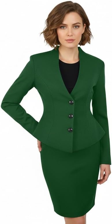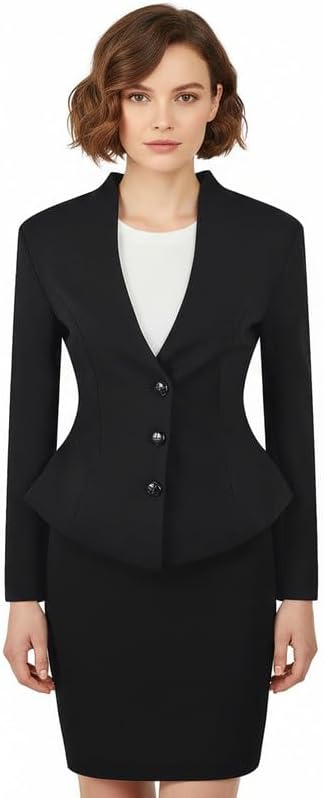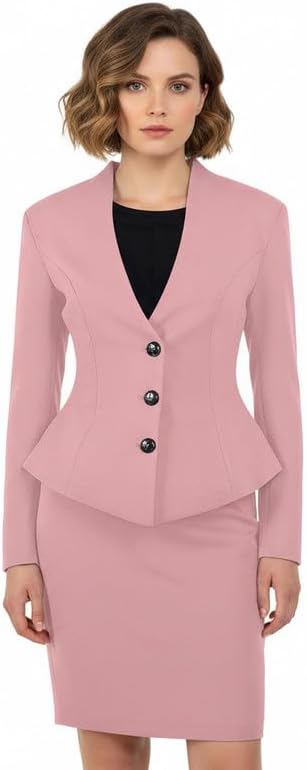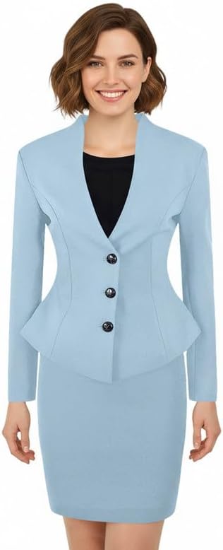 This women’s suit skirt set features a two-piece design with a stand collar peplum blazer, decorative button detail, and a slim-fit pencil skirt for a polished silhouette.Crafted for elegance and comfort, the ruffled blazer enhances the waistline while offering multiple color options to suit different styles.Ideal for business meetings, office wear, formal occasions, and evening events, this tailored set delivers a refined and professional look.