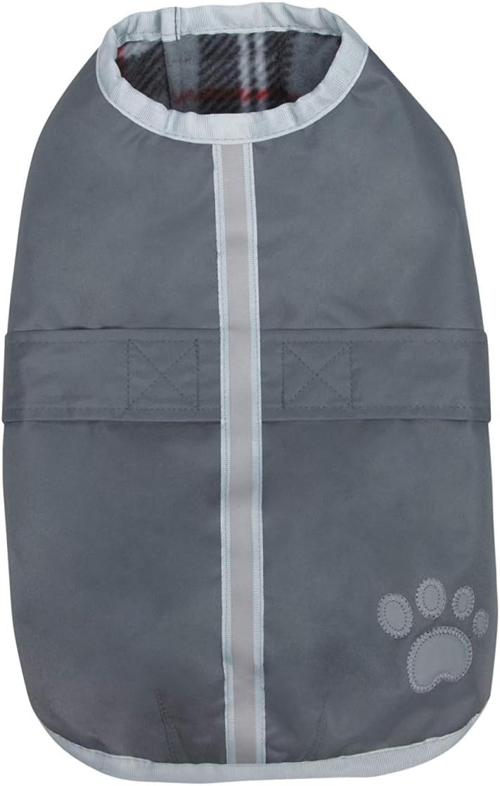 Zack & Zoey Nor'Easter Blanket Coats help pets take a bite out of nasty weather. This jacket features a reversible water-resistant shell, a soft plaid fleece lining and a reflective stripe and paw print detailing on back with neck and belly Velcro closures for an adjustable fit. Comes in polybag with a hanger and hangtag. Please have the attached asin's product descriptions setup like below as the product details need to be clearly seen for the customer and everything is jammed together. Zack & Zoey Nor'Easter Blanket Coats help pets take a bite out of nasty weather. This jacket features a reversible water-resistant shell, a soft plaid fleece lining and a reflective stripe and paw print detailing on back with neck and belly Velcro closures for an adjustable fit. Comes in polybag with a hanger and hangtag. Material: 100% Polyester Care Instructions" Machine was cold on gentle cycle. Line dry. How to Measure your Dog: Back: Measure length of pet's back from the base of the neck to the base of the tail. Neck: Measure the circumference of pet's neck for a snug fit. No need to add Inch as you would with collar. Chest/Girth: Measure the girth around the broadest part of the chest and add 2 inches. See sizing chart in product details for sizing information or the size chart image located with the images to order proper size.
