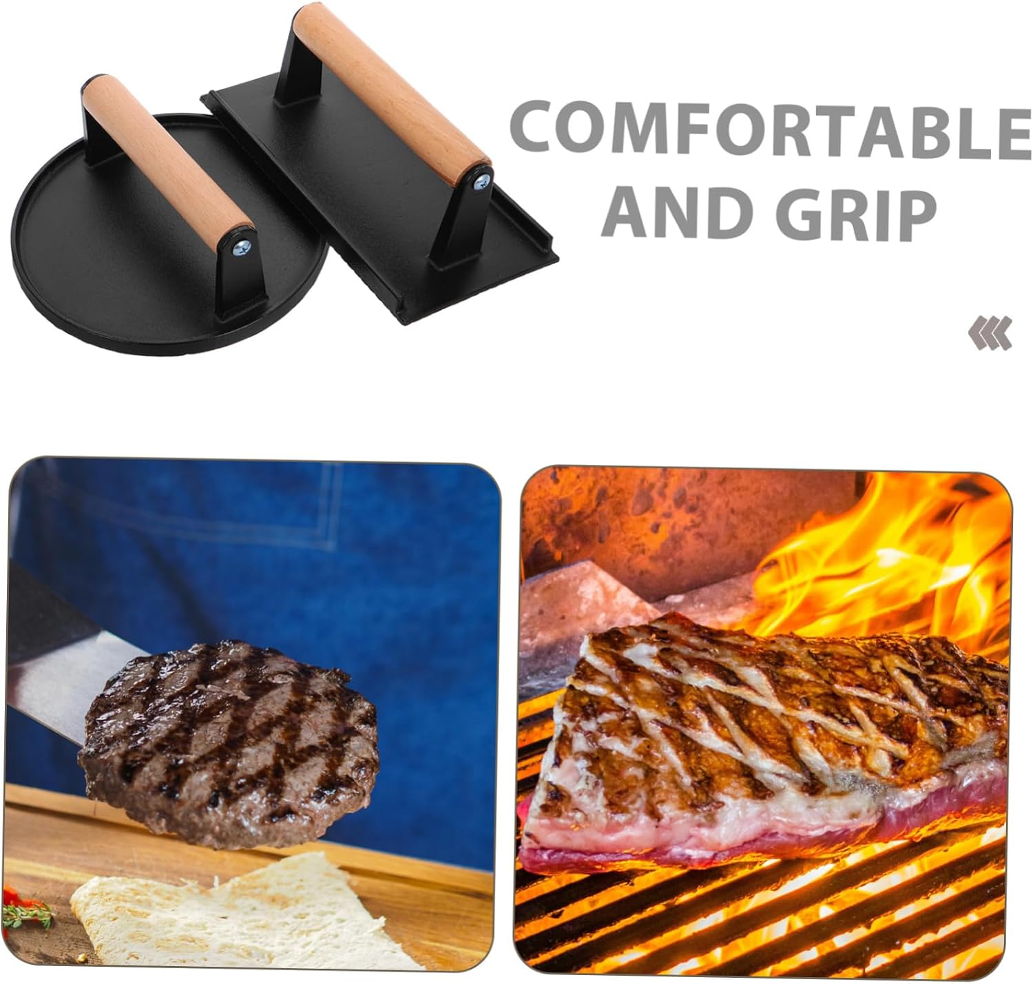 Package List 1 x round meat press 1 x Rectangular meat press Characteristics - noncoated design: the noncoated surface safety and cleanliness, and it can be to create a nonstick surface like iron skillet hamburger smasher tool. -Adaptable long press plate: the long press plate is designed to handle various sizes of meat, making it versatile and efficient for different cooking needs burger . -Ergonomic wooden handle: the cast iron press features an ergonomic wooden handle that provides a comfortable and secure grip, preventing slips during use bacon weight. -Size:21.00X10.50X7.00cm/8.25X4.13X2.75in meat press -Multipurpose functionality: suitable for steaks, burgers, and more, this press is a versatile tool that enhances your cooking experience with its multifunctional design steak weight. -Enhanced cooking efficiency: capable of pressing multiple pieces of meat at once, this press boosts your cooking efficiency and saves time sausage press. -Color:Black cast iron tortilla press -Material:Cast iron + wood burger press -Size:17.50X17.50X6.50cm/6.88X6.88X2.55in grill smasherGoods Descriptionbarbecue press The rectangular design is great for larger cuts of meat, ensuring they cook thoroughly and retain their juices.food press It helps cooking time by evenly distributing heat and pressing meats flat for faster, more even cooking.burger patty maker Whether you're grilling outdoors or cooking in your kitchen, this cast iron press with a wooden handle is an essential tool